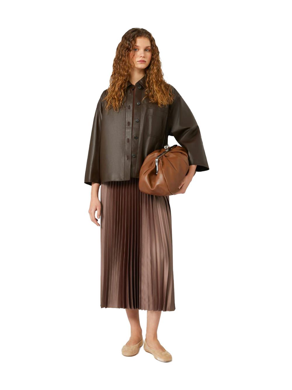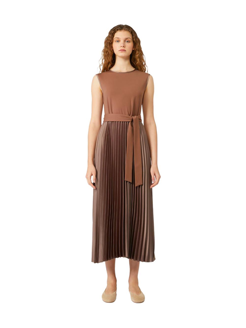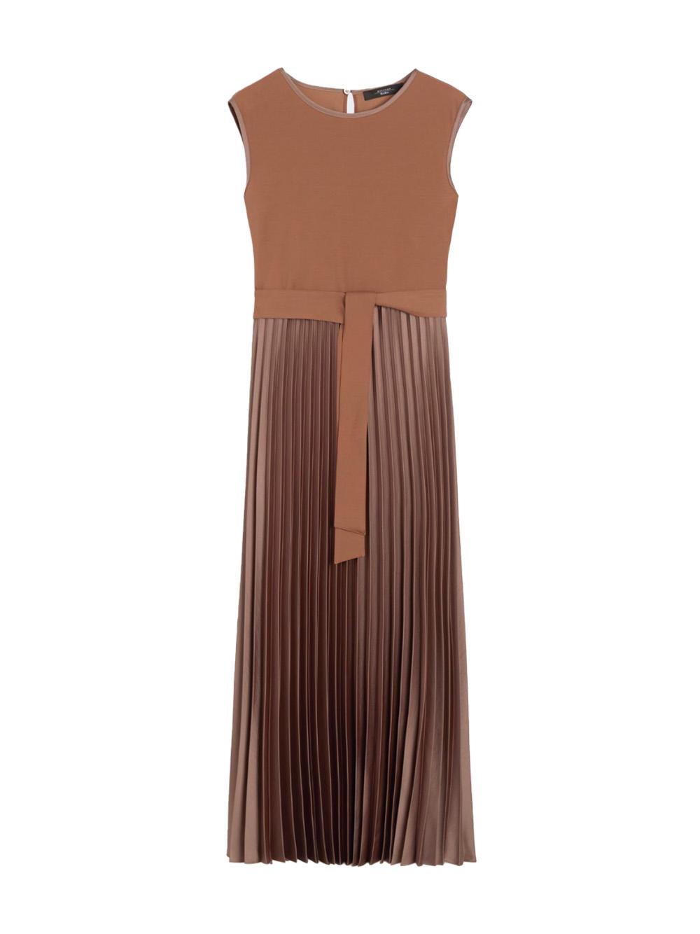 - Abito lungo con gonna ampia in raso a pieghe plissé soleil.