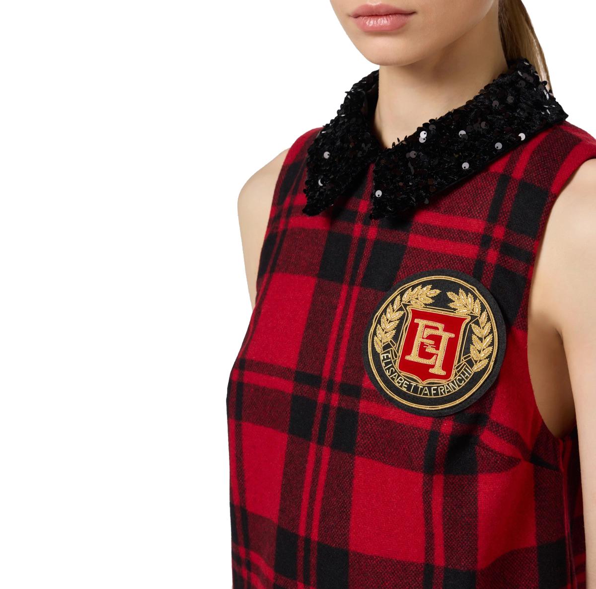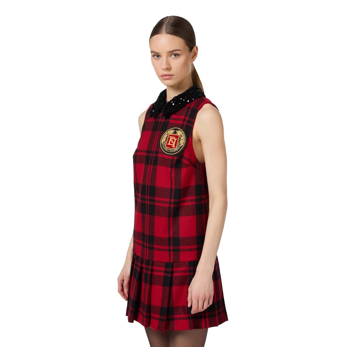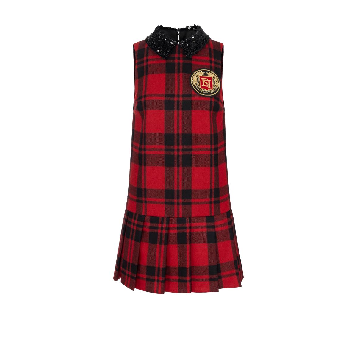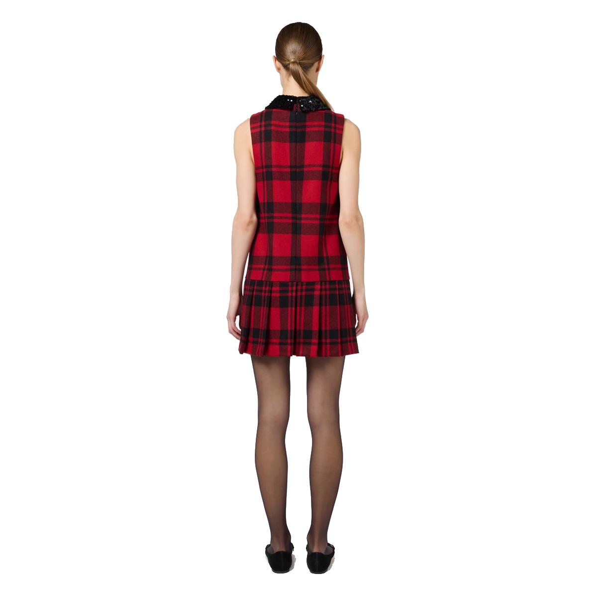 Miniabito in lana tartan rosso con patch ricamato
