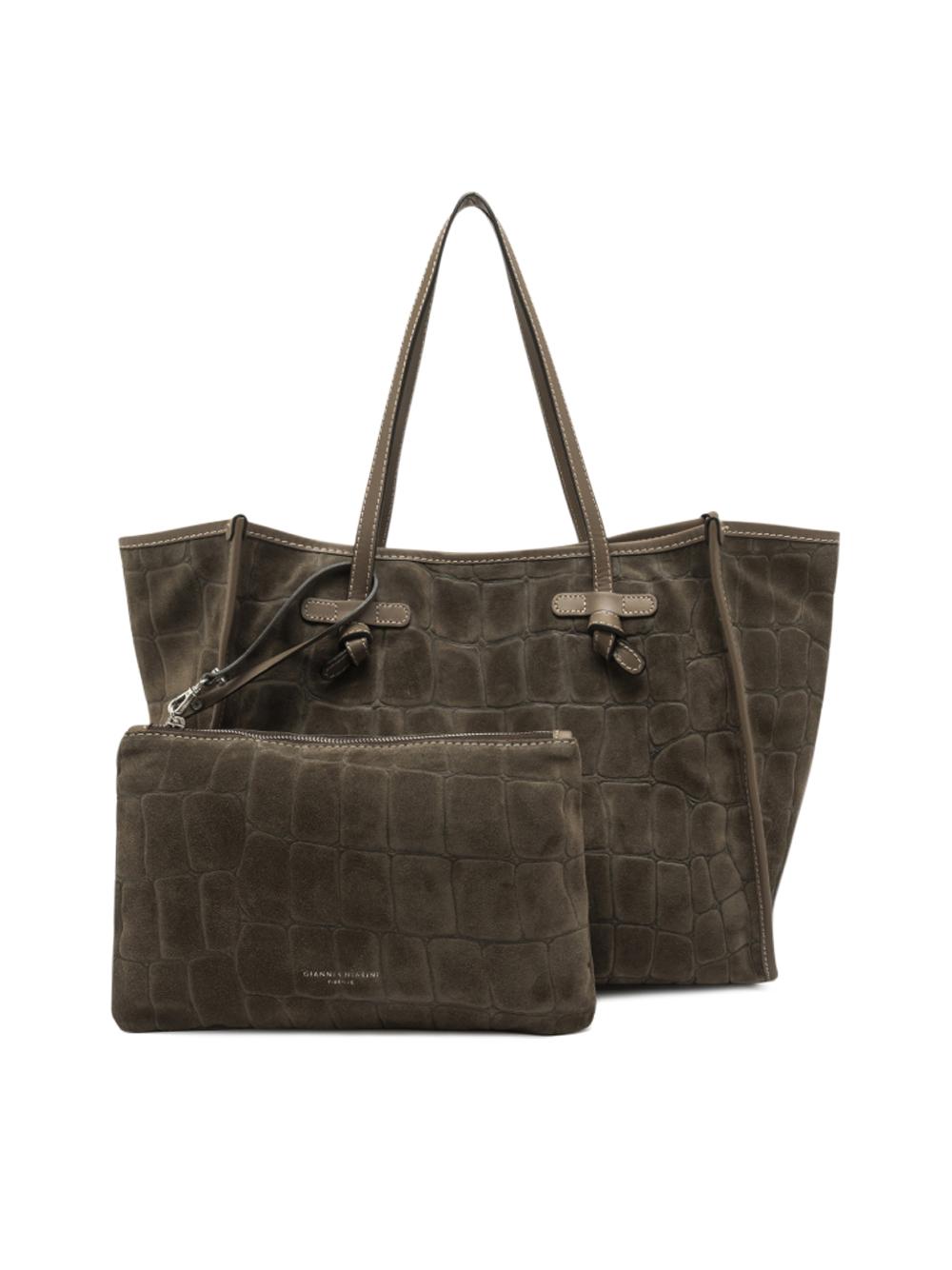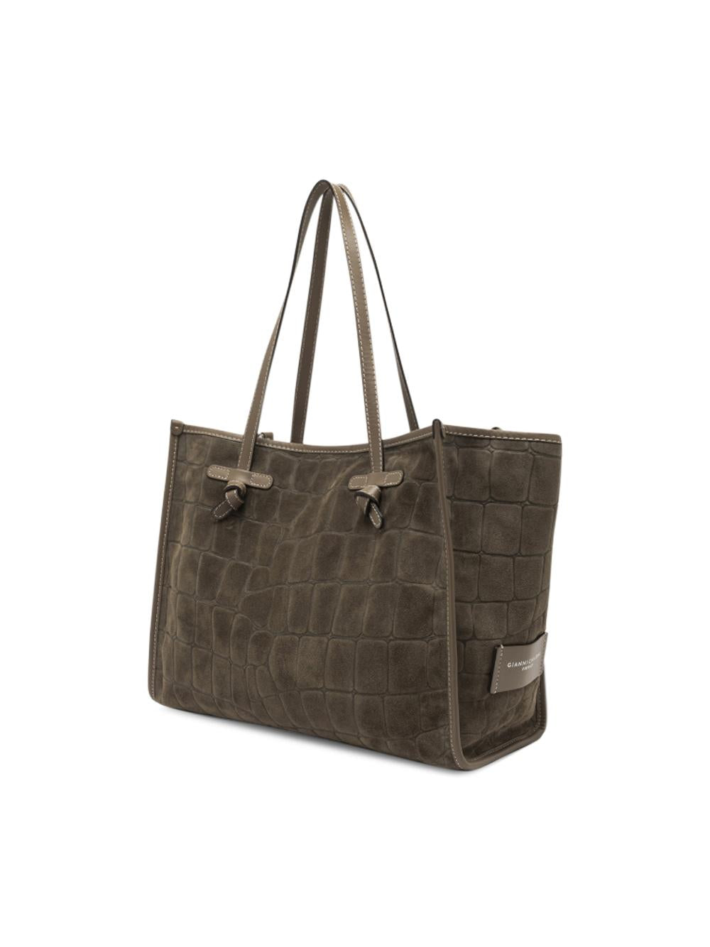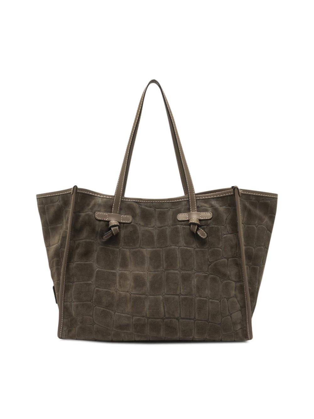 • La shopping Marcella by Gianni Chiarini Firenze, dalla silhouette semplice e moderna, è realizzata in pelle scamosciata con una maxi stampa cocco, un elemento distintivo che aggiunge carattere e stile.
