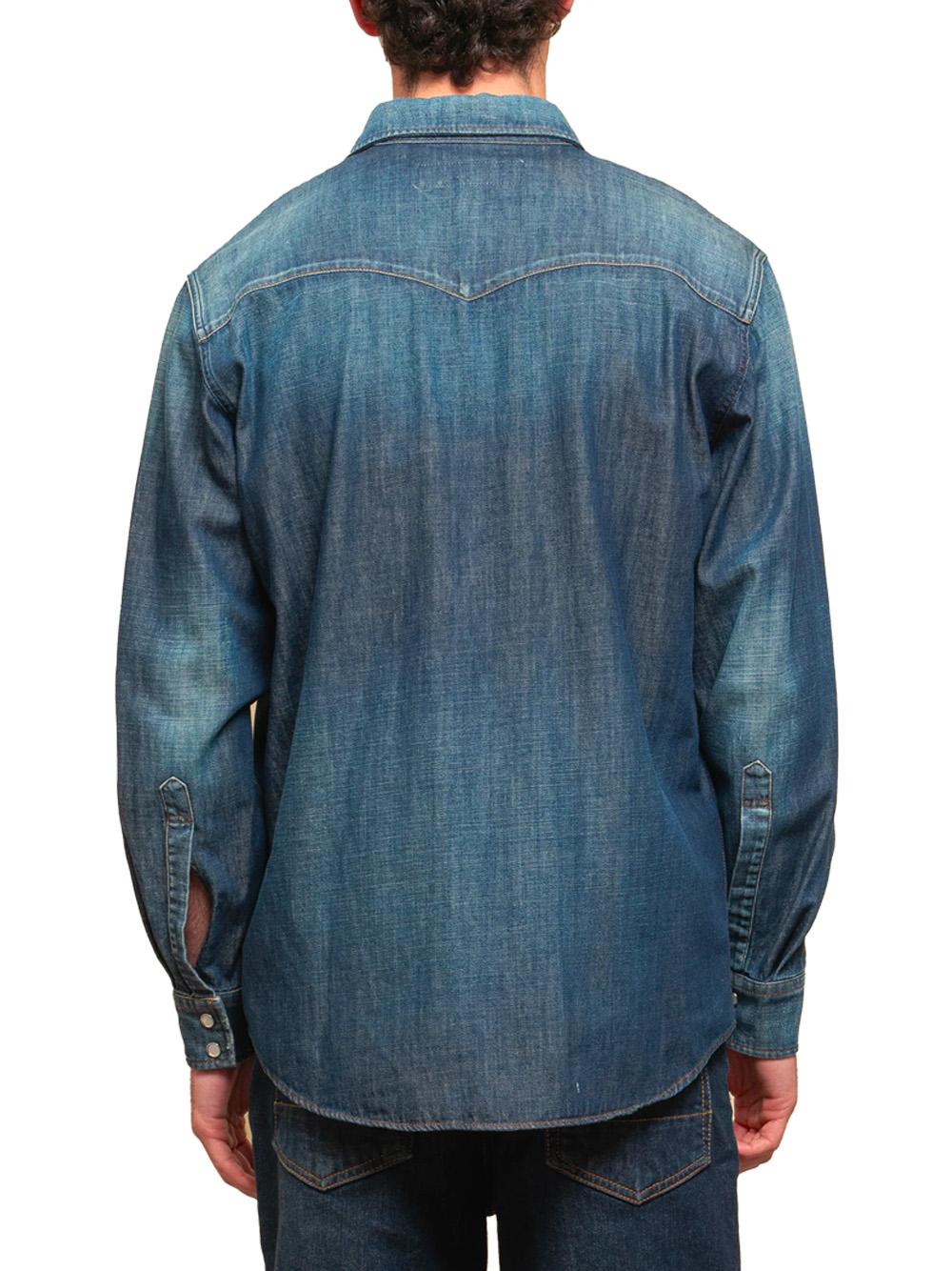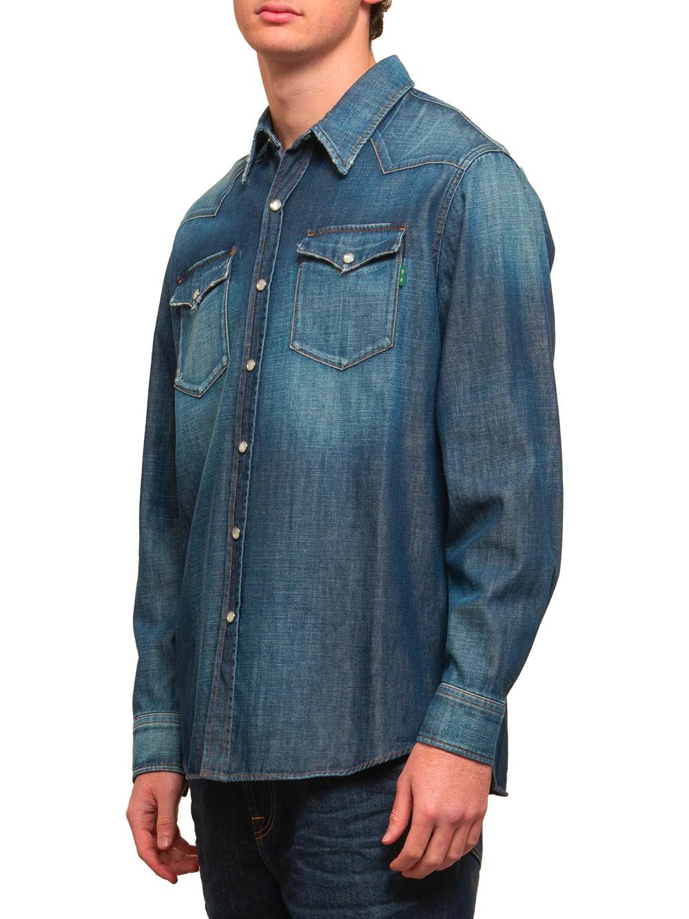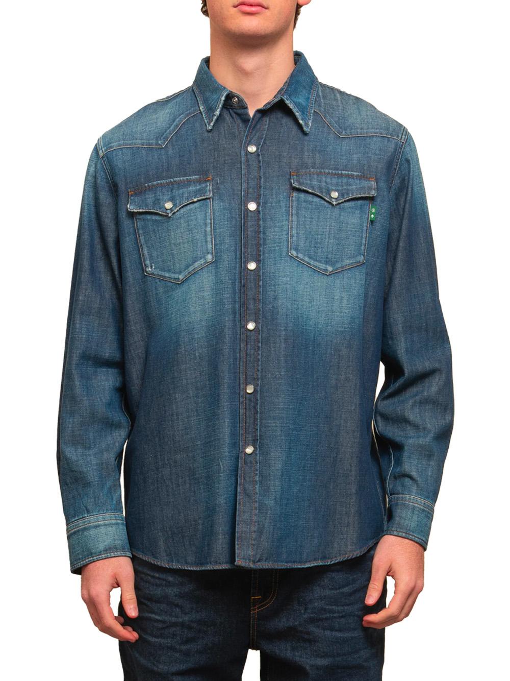 - Lavaggio scuro, colletto classico, chiusura con bottoni a pressione, maniche lunghe, due tasche con patta davanti, orlo curvo