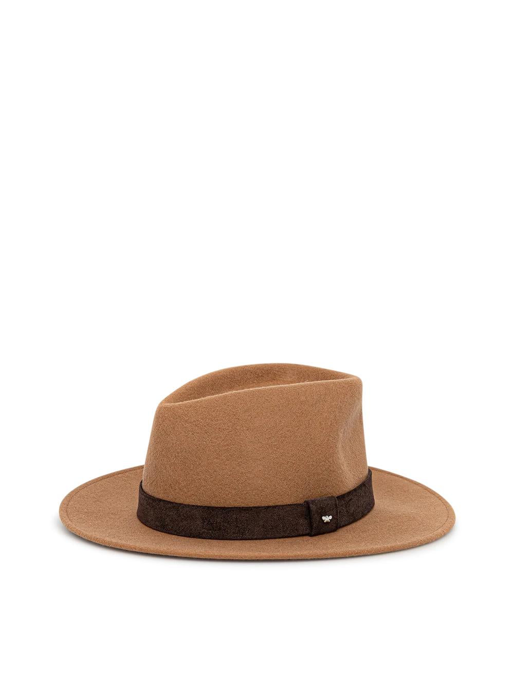 - Cappello modello fedora, rifinito da nastro in pelle scamosciata e borchia a farfalla in metallo sulla corona.