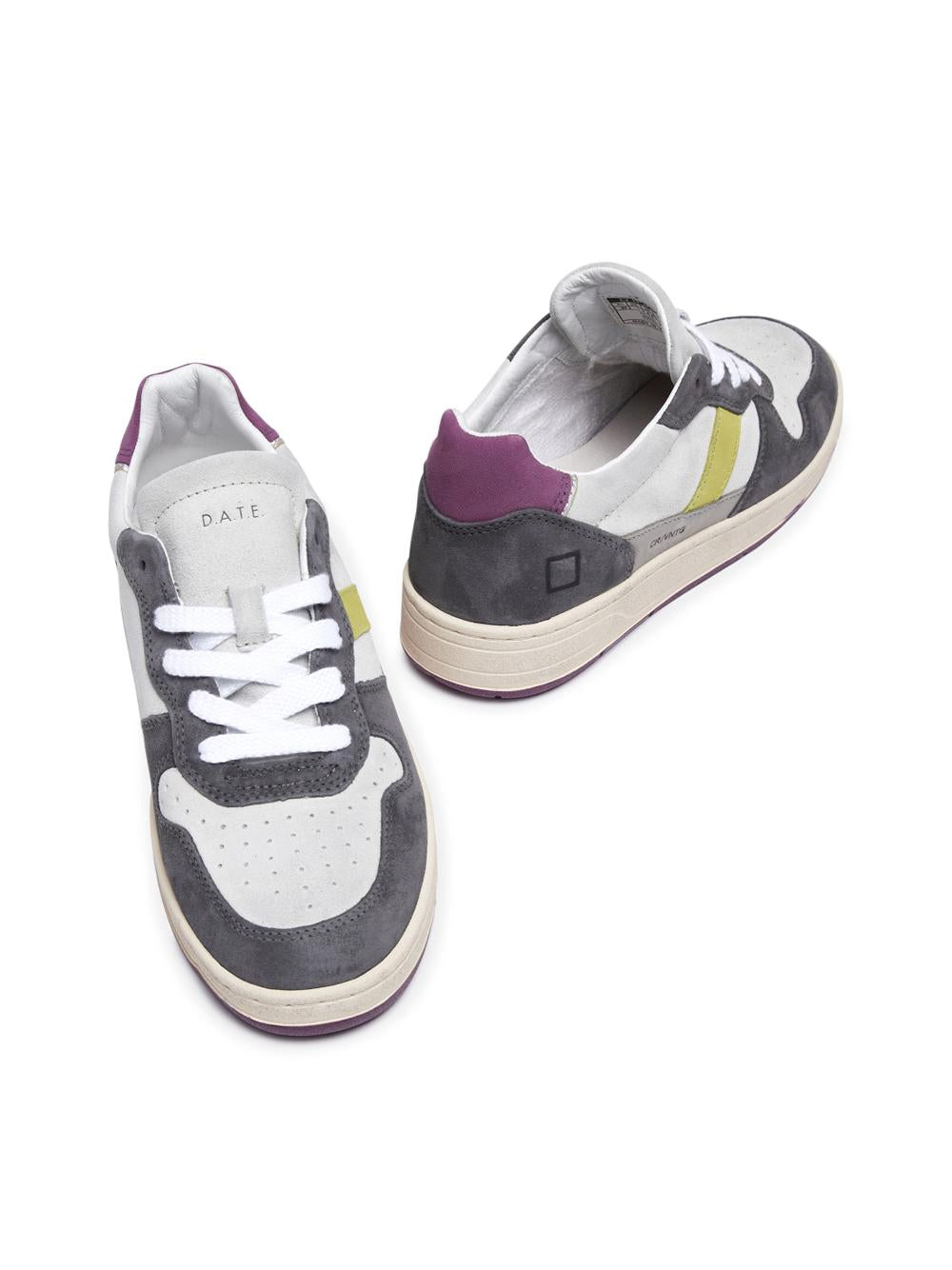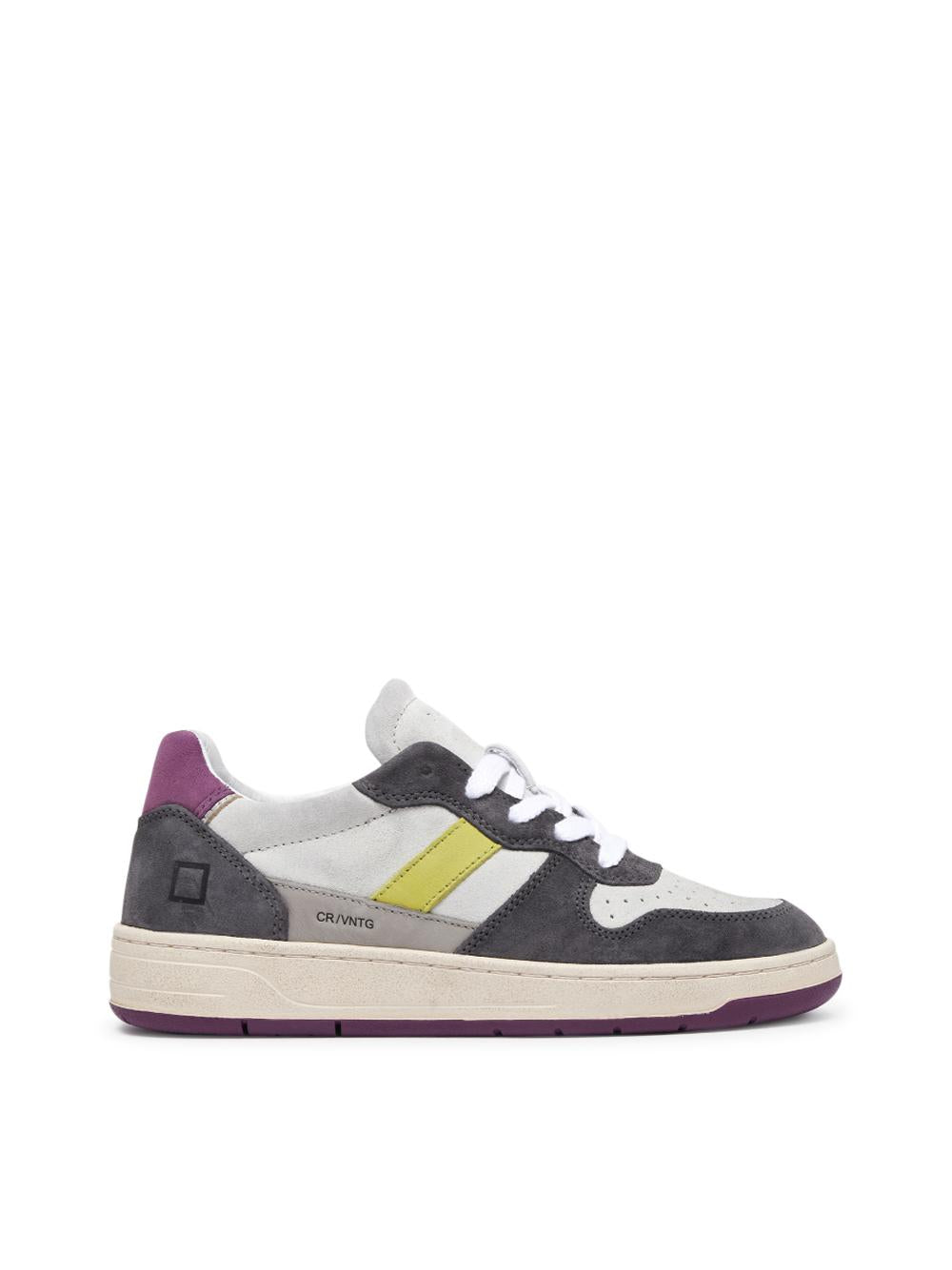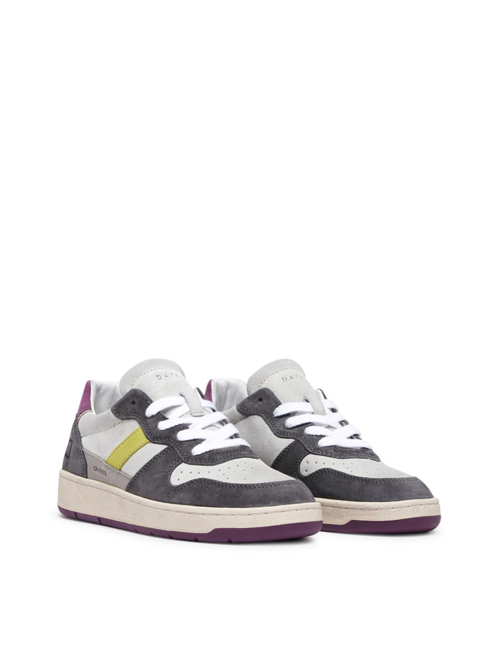 - Inserti in camoscio grigio, banda laterale in pelle verde lime e talloncino posteriore in pelle viola