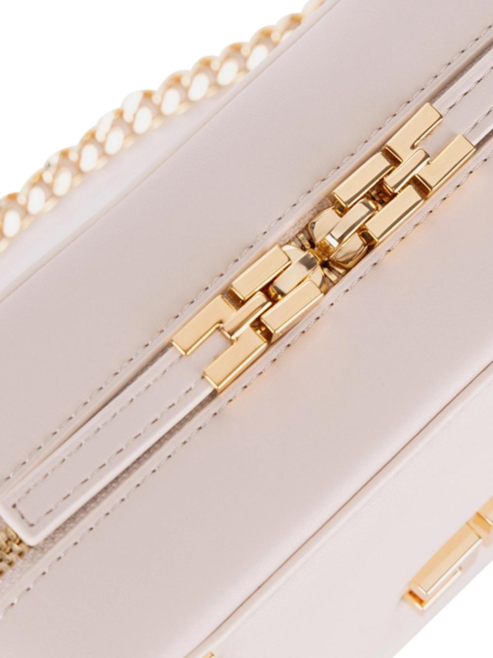 - È caratterizzata da tracolla in catena, angoli in metallo e placca logo in metallo dorato.