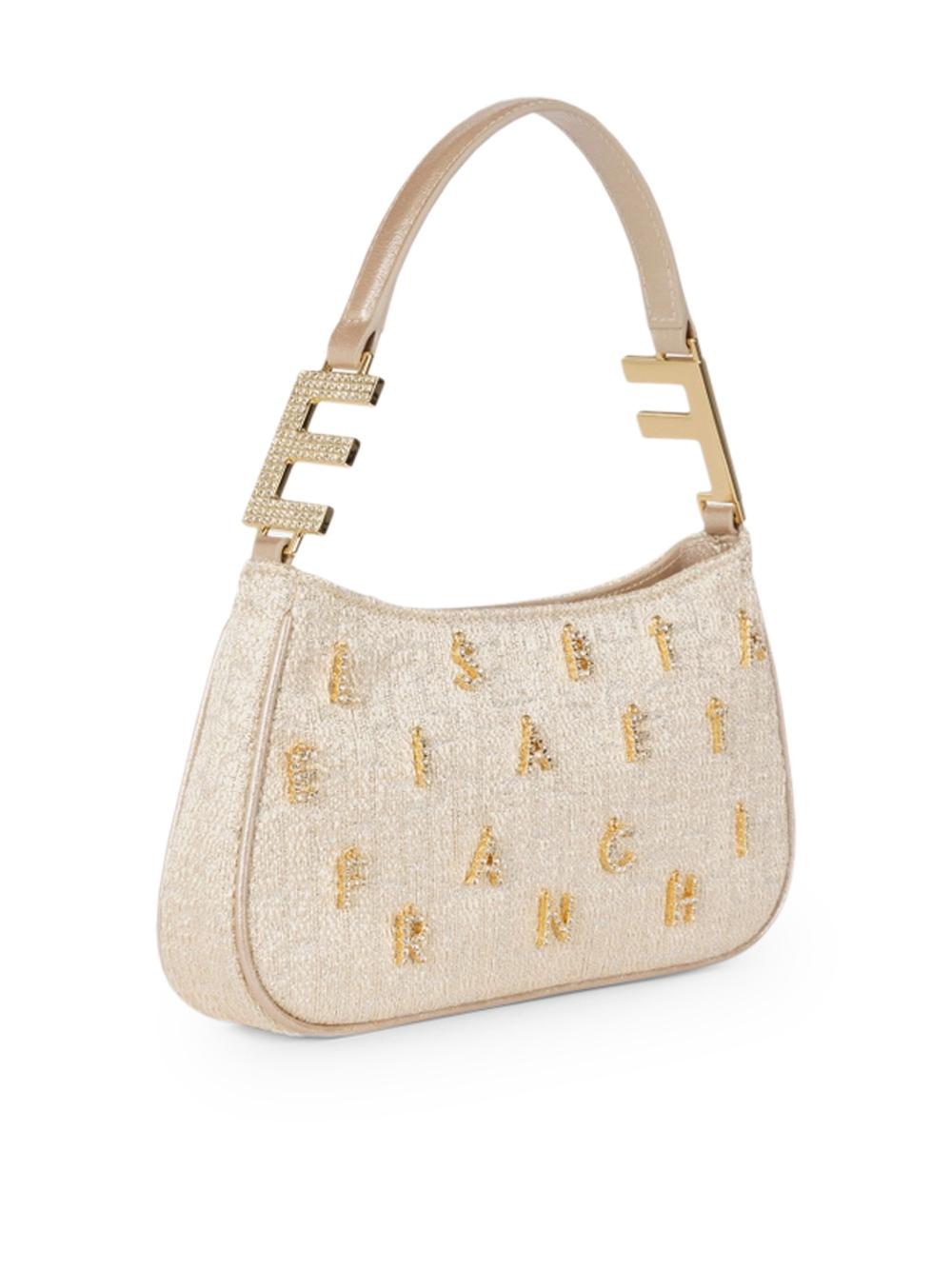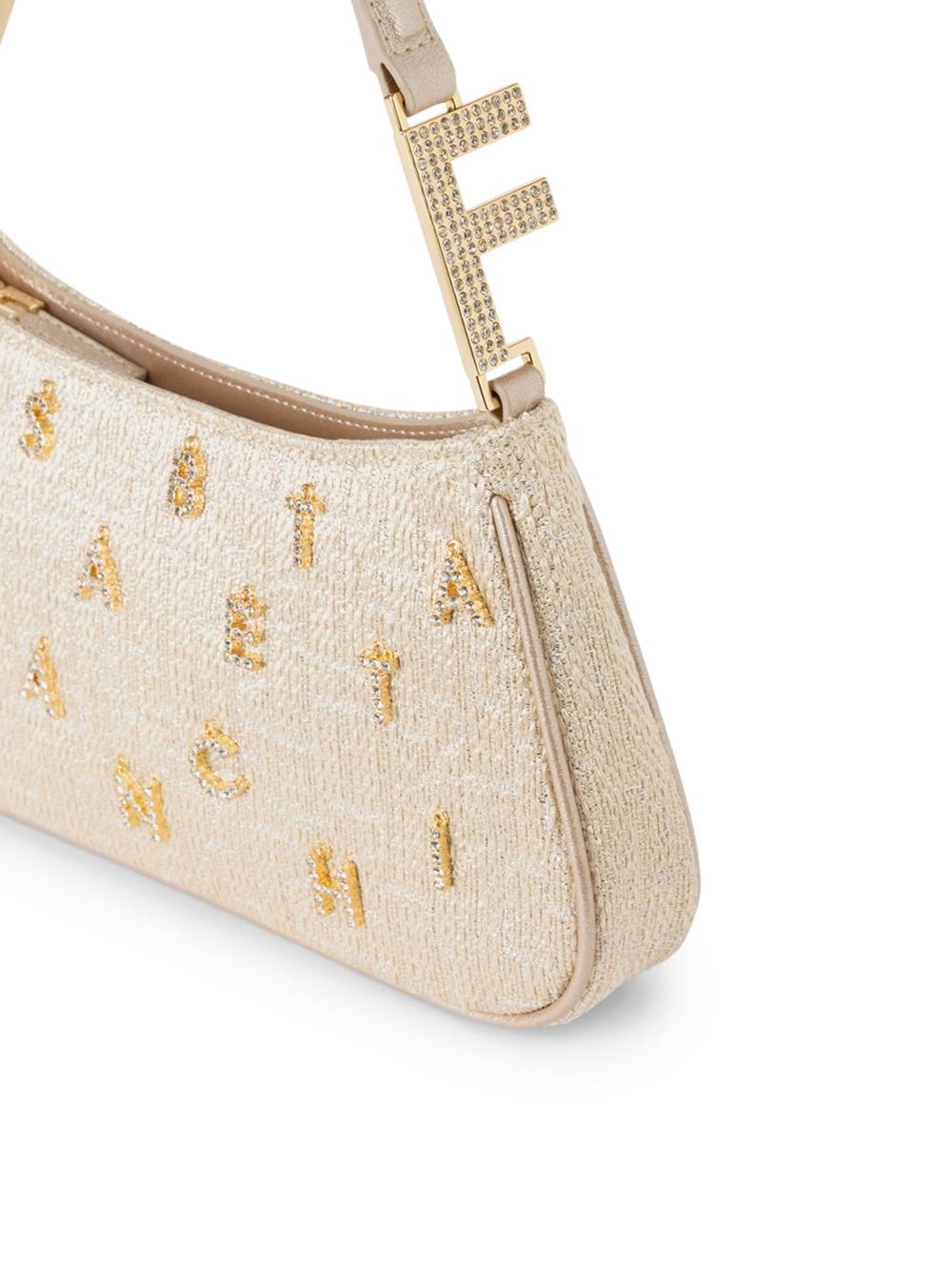 Borsa a spalla in tweed lurex oro con lettering di strass