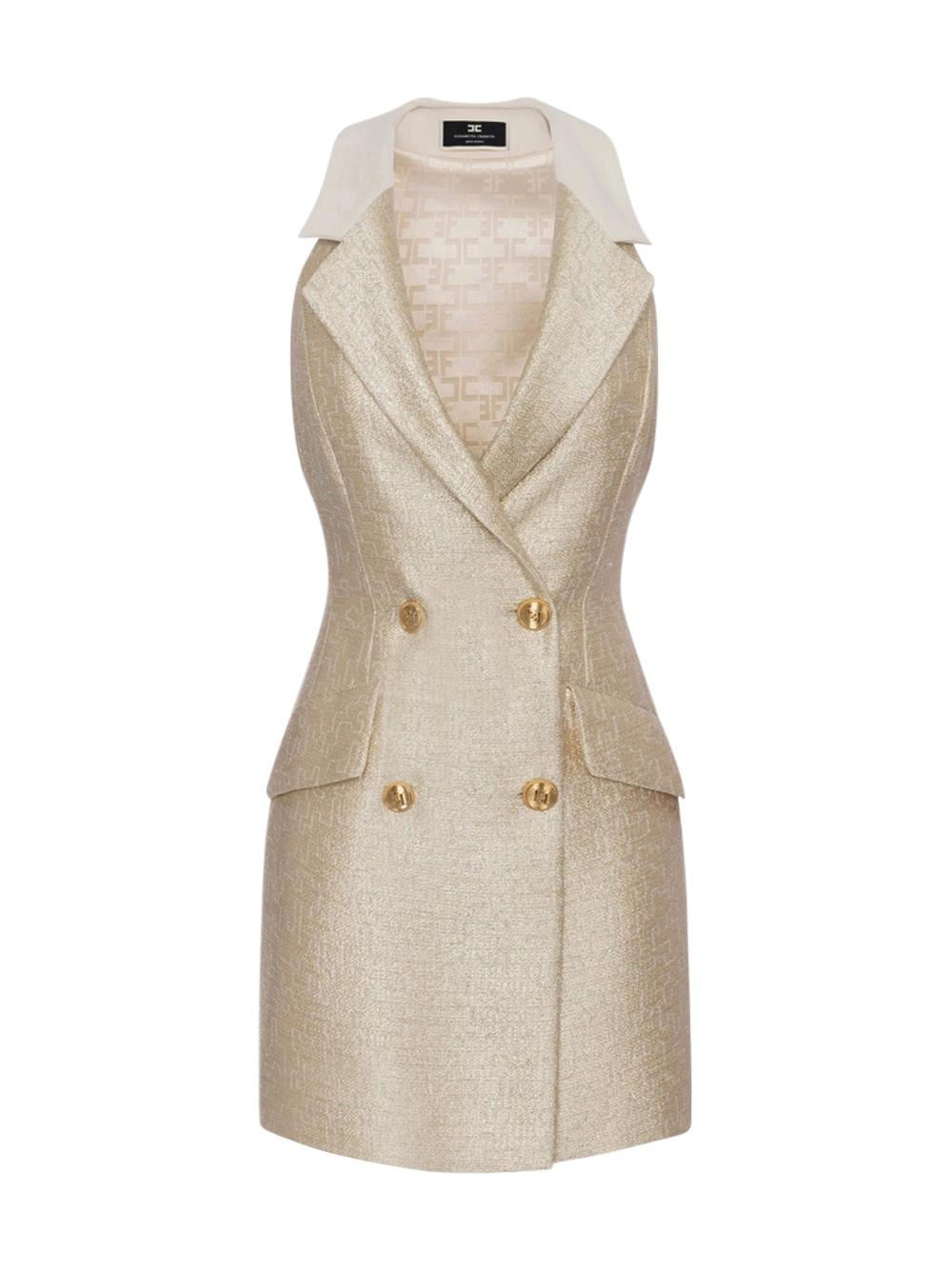 - Robe-manteau doppiopetto in tweed lurex smanicato con applicazione di bottoni in metallo dorato e tasche a patta.