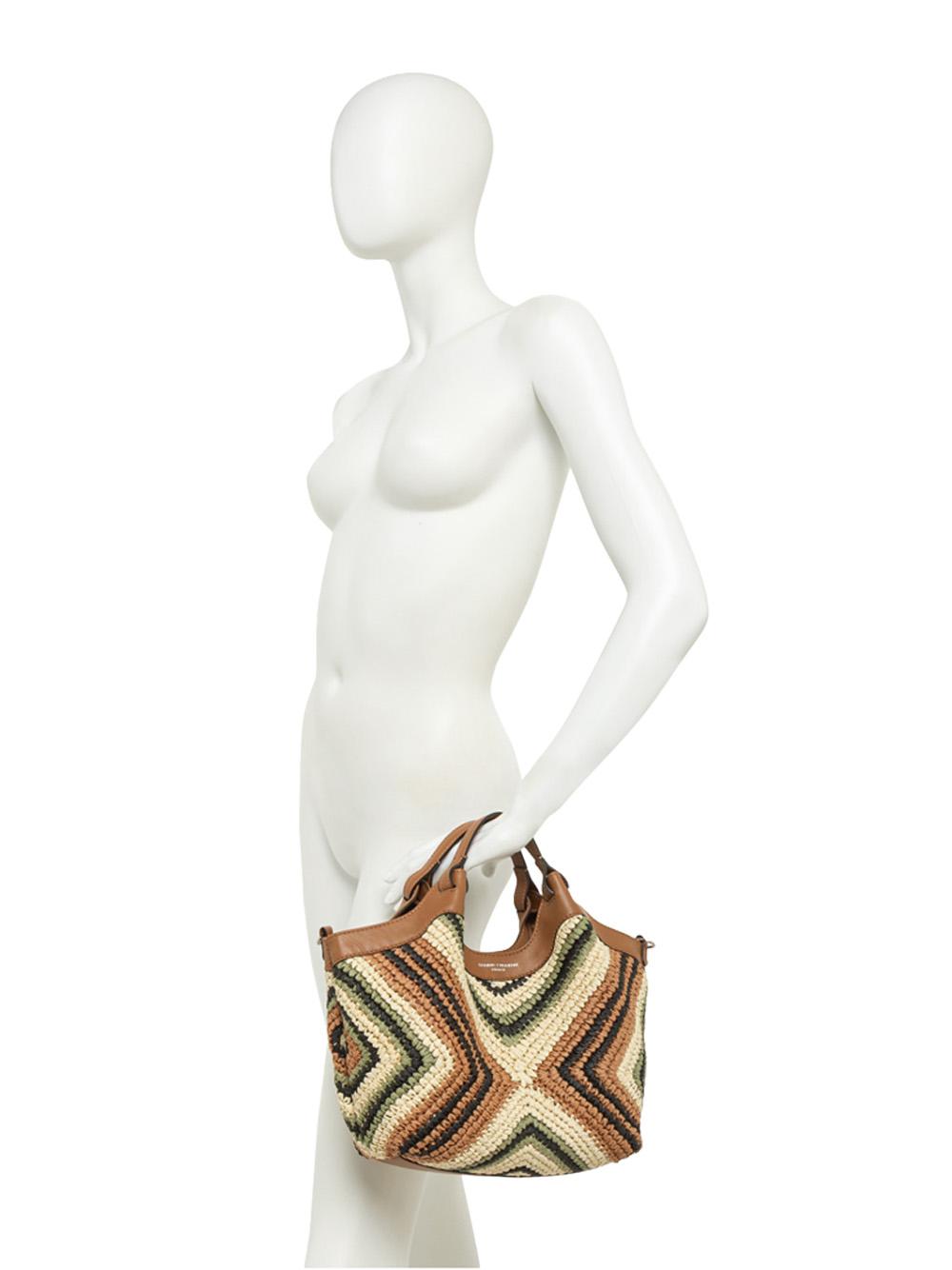 - L'icona del brand, la borsa DUA, è realizzata in paglia intrecciata, caratterizzata da una texture unica e distintiva.