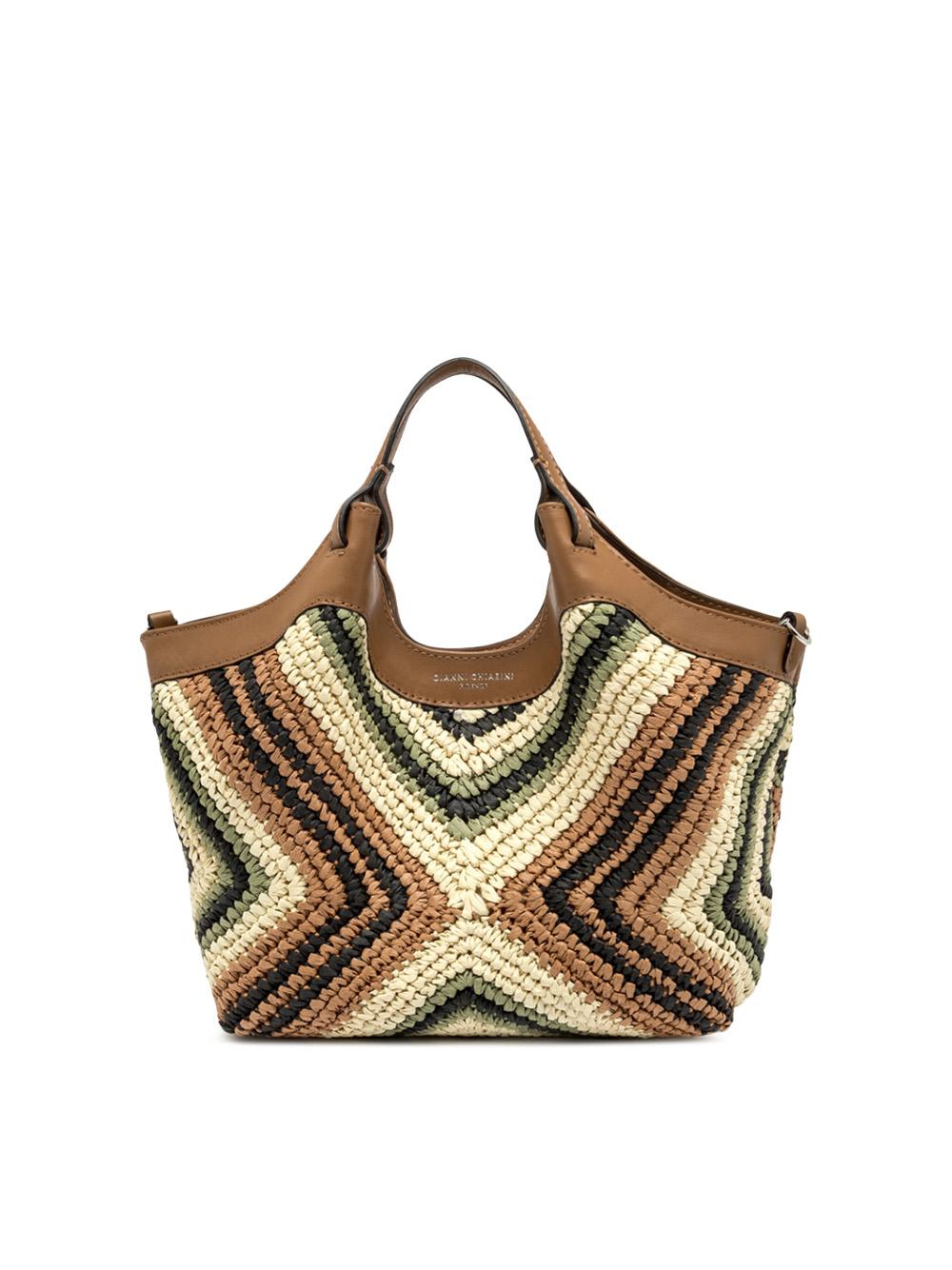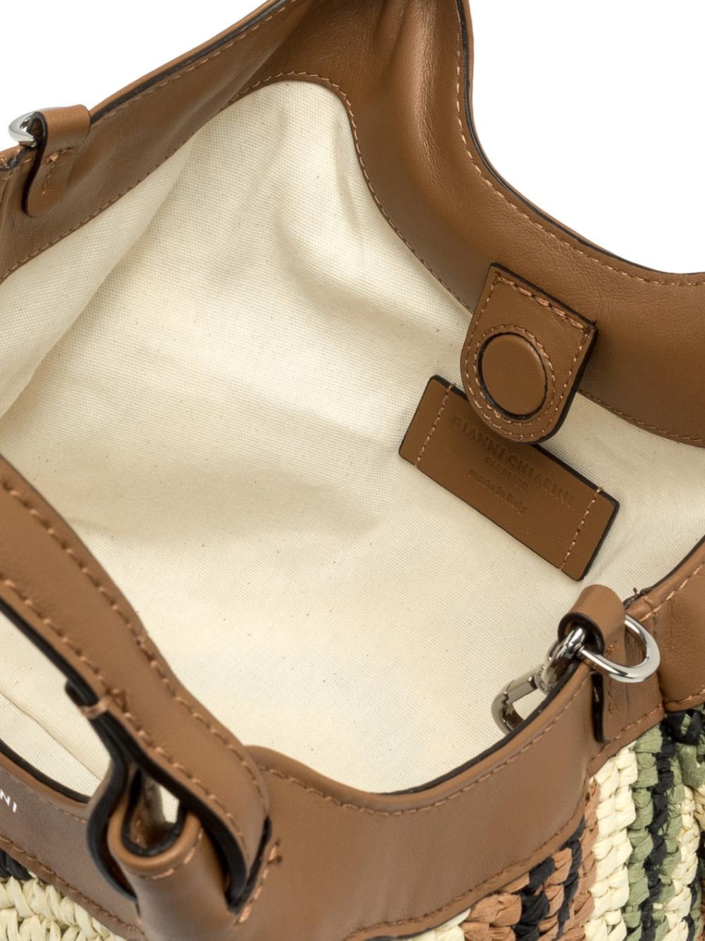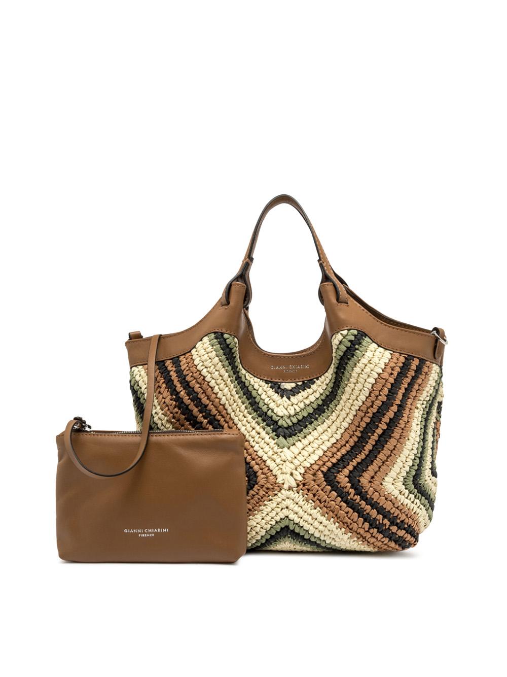 - Dotata di un monoscomparto, presenta profili superiori in pelle e doppi manici in tono.