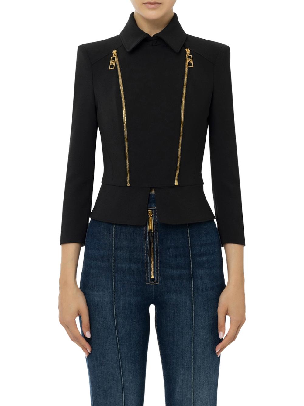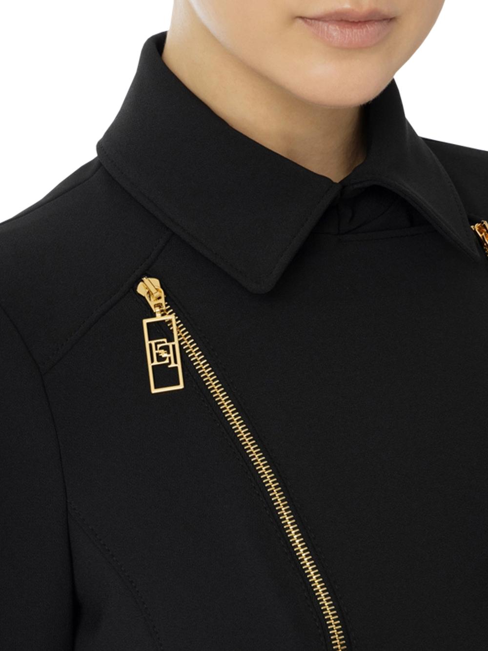 - Giacca in doppio crêpe stretch con baschina al fondo. È caratterizzata da chiusura a doppia zip rifinite da tiretto logato.