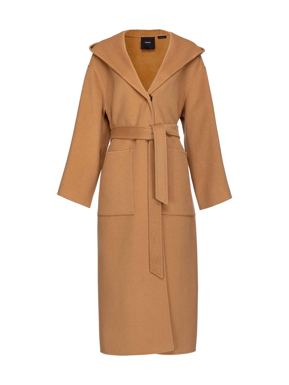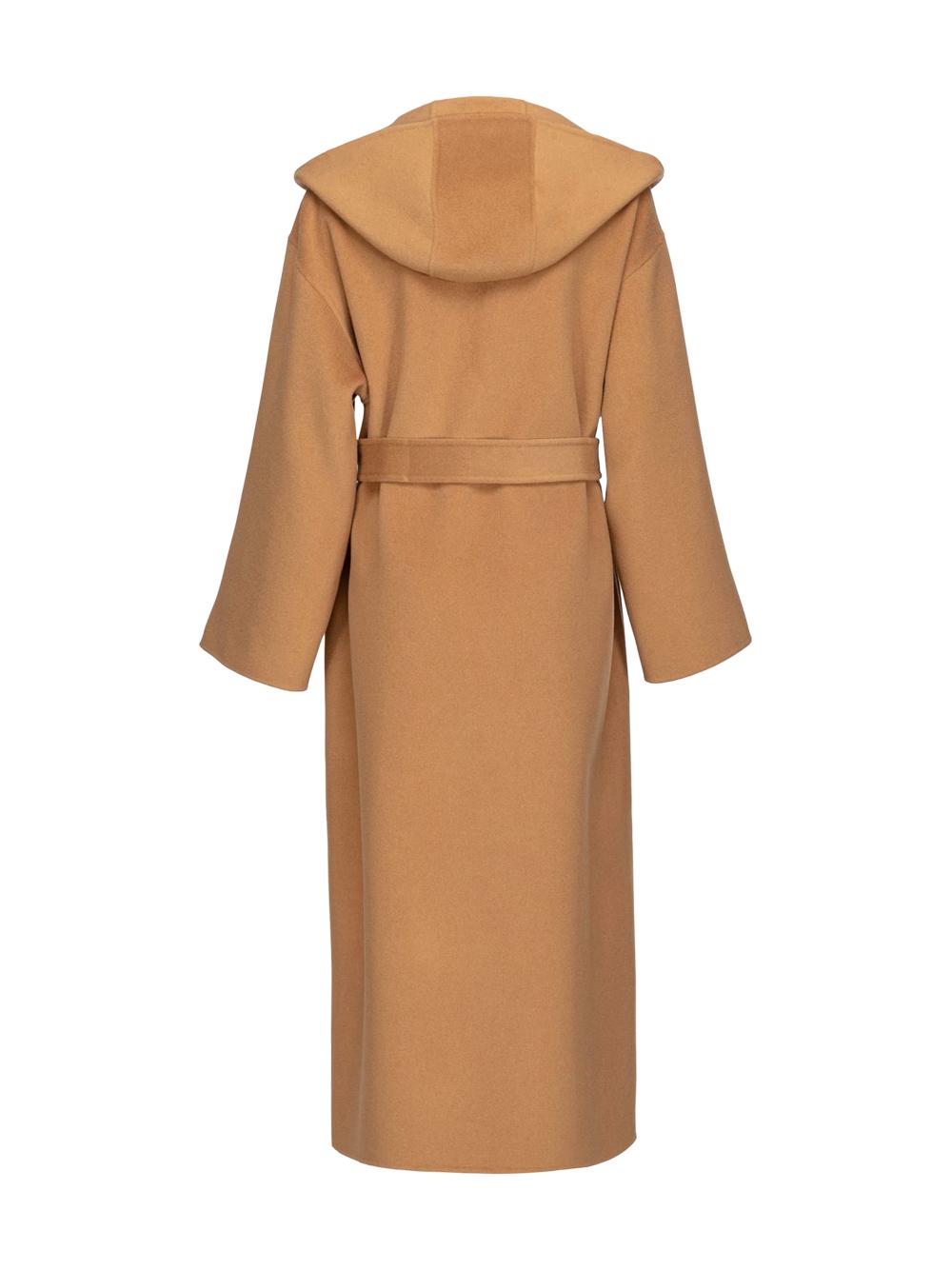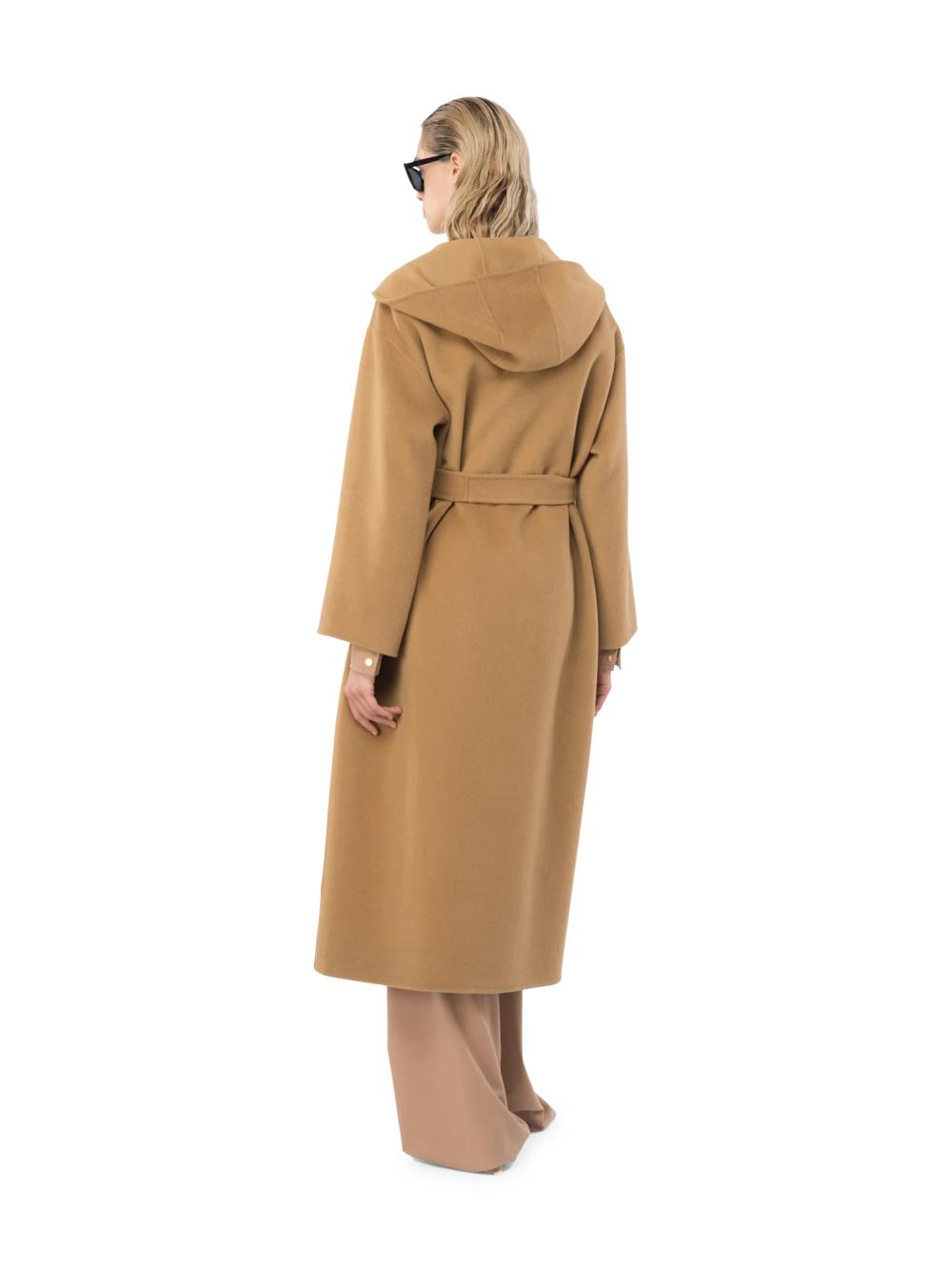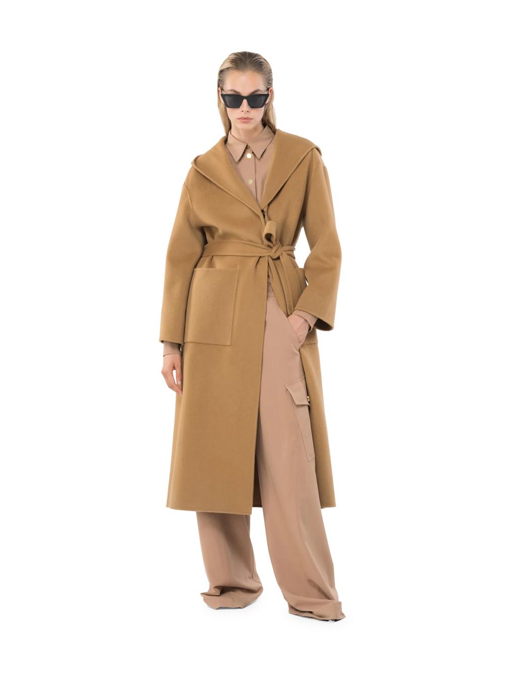 Cappotto lungo con cappuccio in panno color cammello