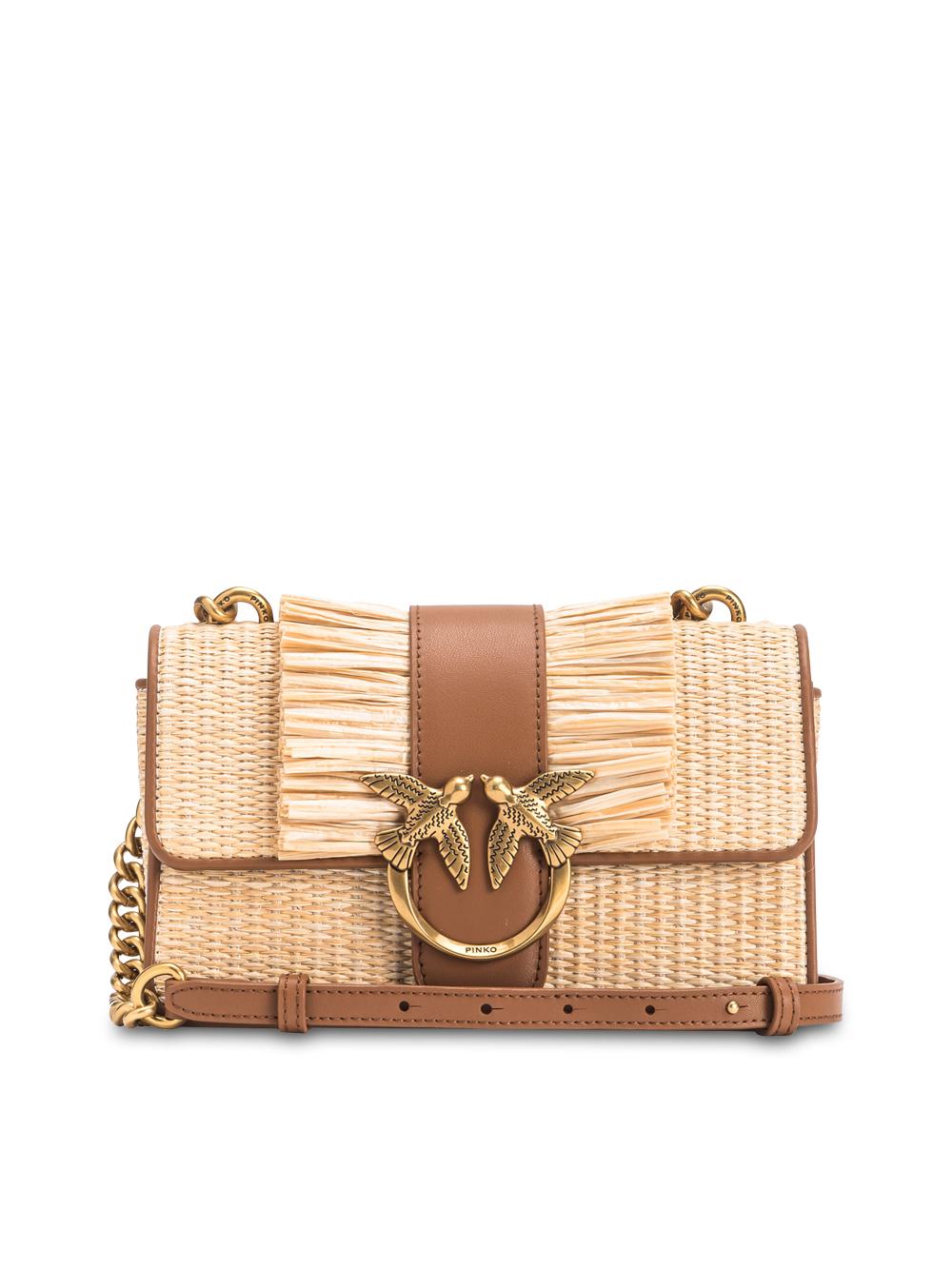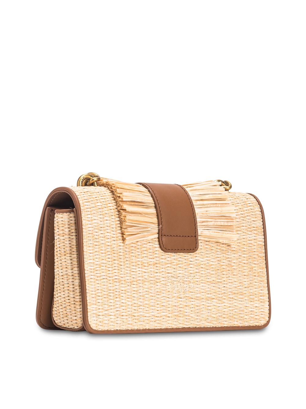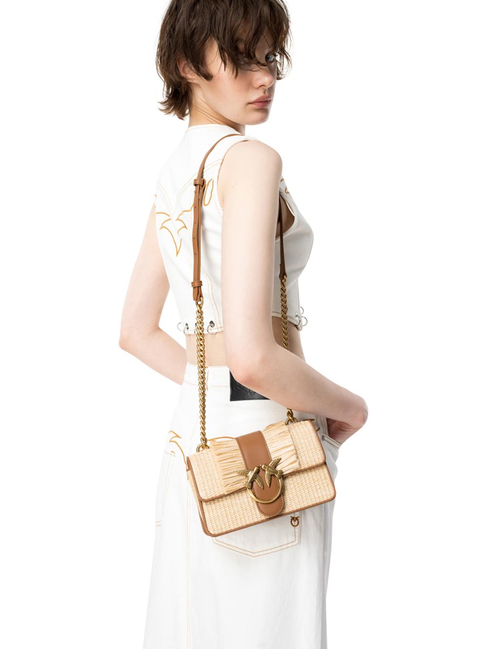 - Mini Love Bag One Light, dal design decostruito e leggero, in rafia con dettaglio sfrangiato sulla patta e profili in pelle.