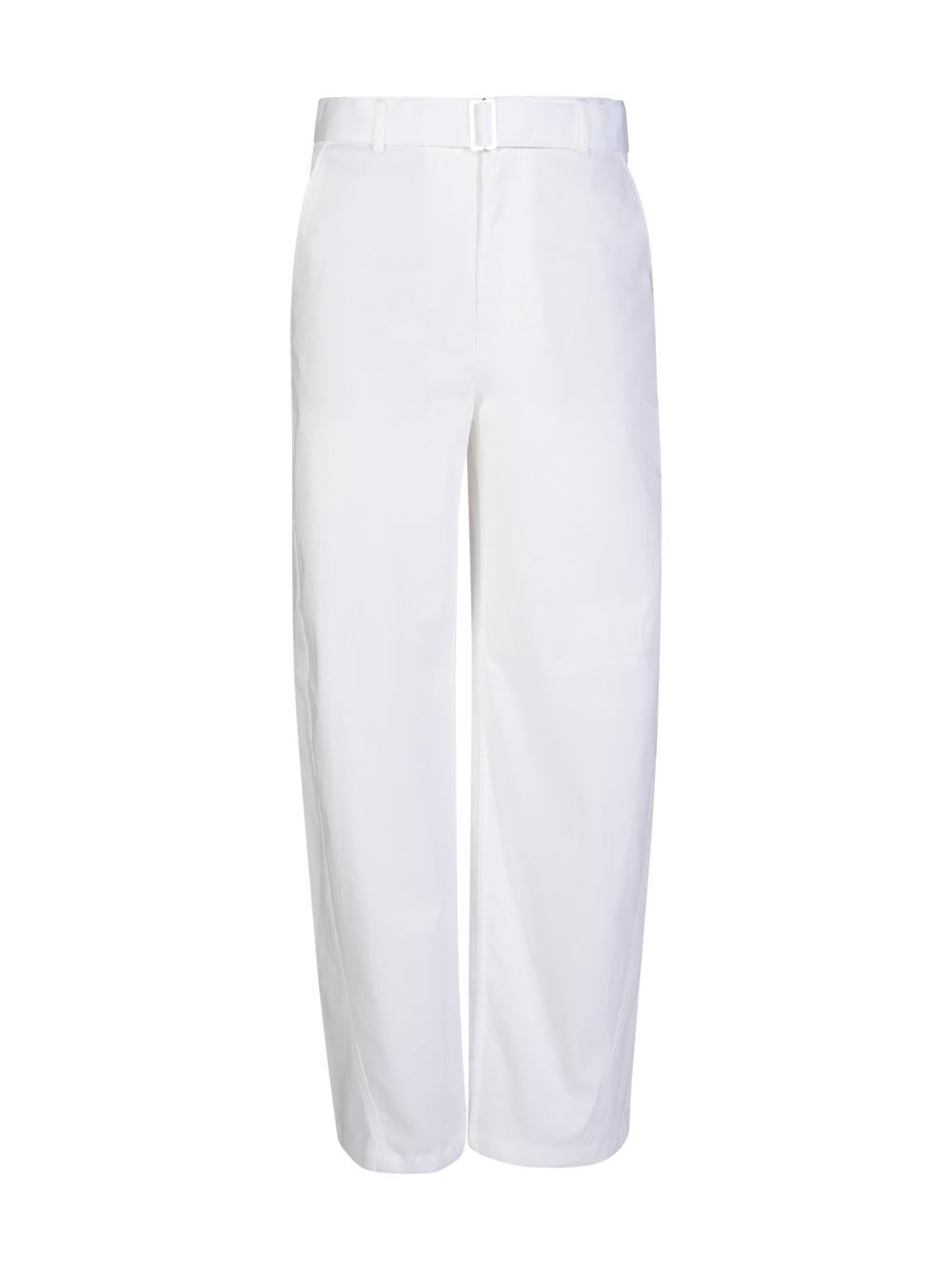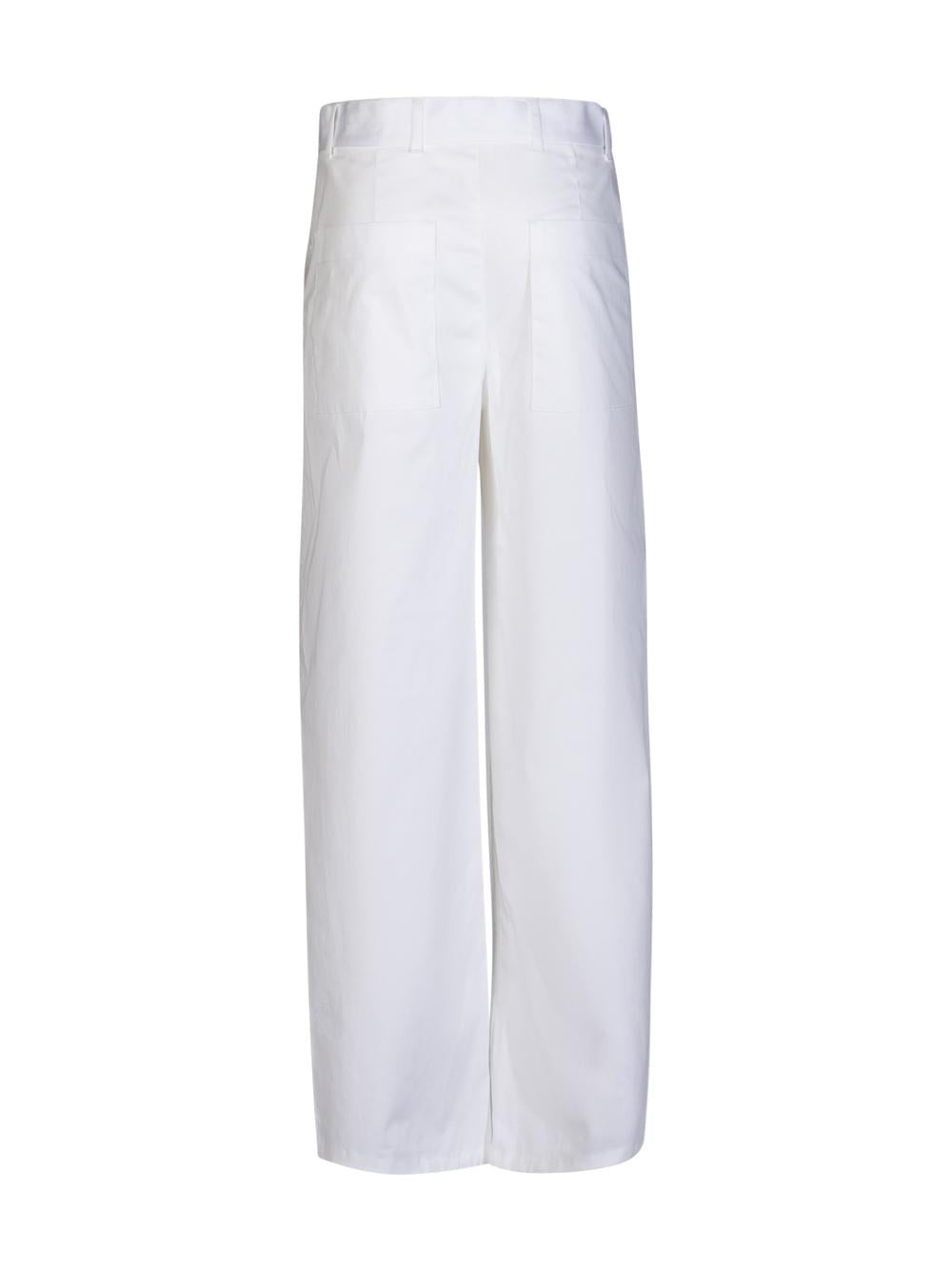 • Stretch gabardine, front closure with button and zip, mid-rise waist, belt loops, welt pockets on the sides, flap pockets at the back, wide leg
