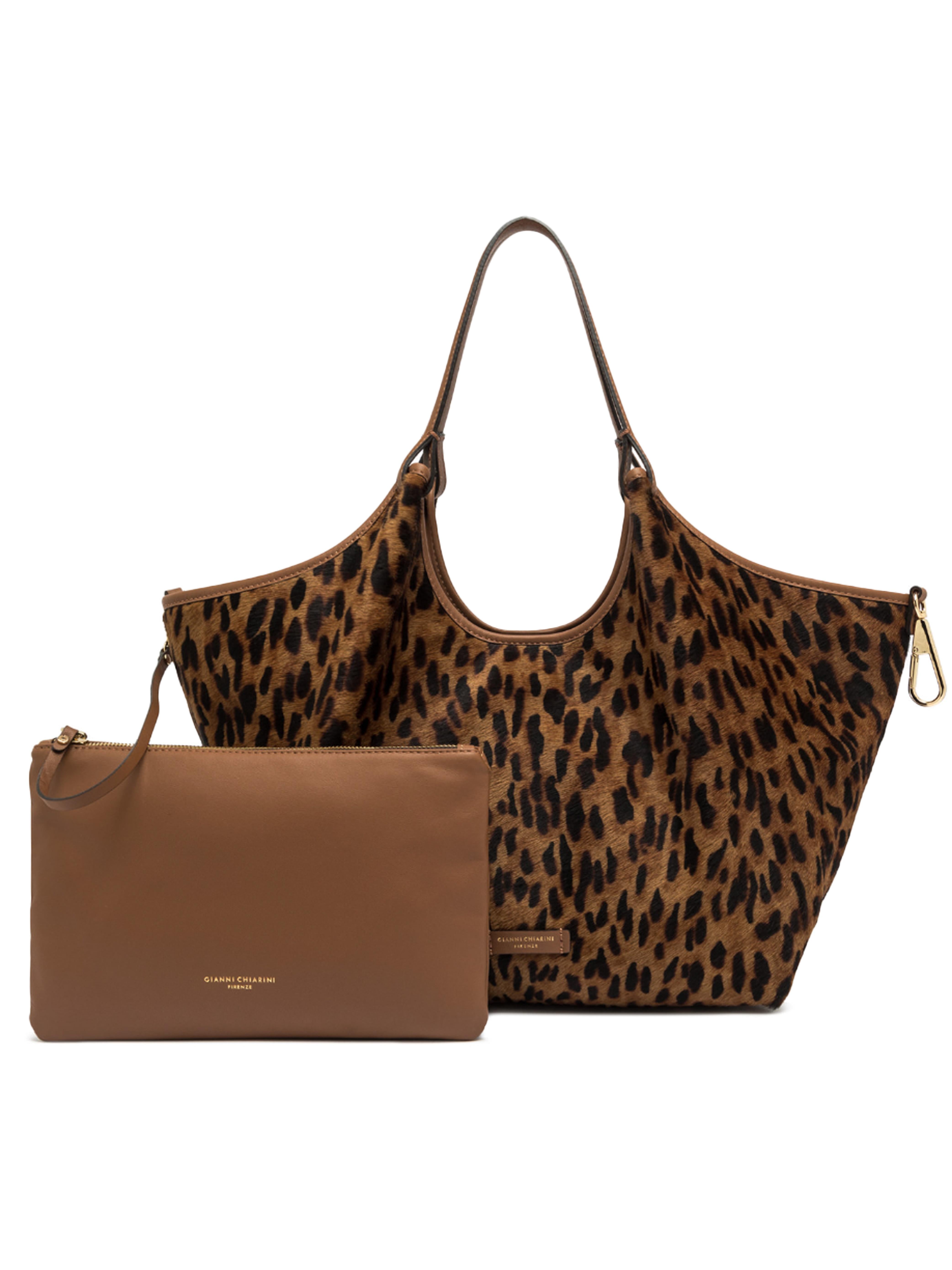 - Unlined single compartment, equipped with a smooth solid-colored leather pouch with a zip closure.