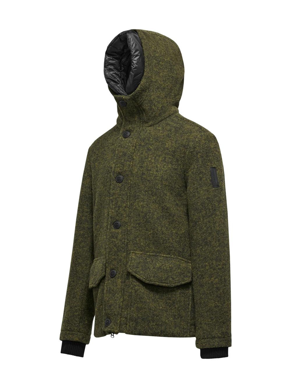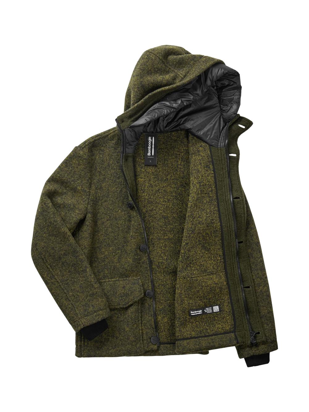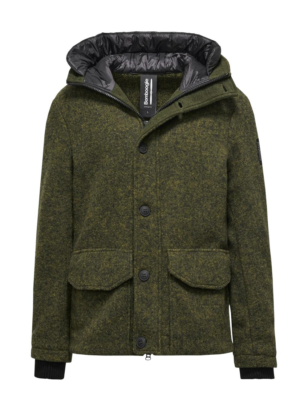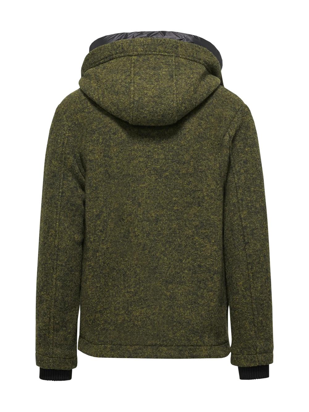 Short parka in boiled wool with dark olive hood