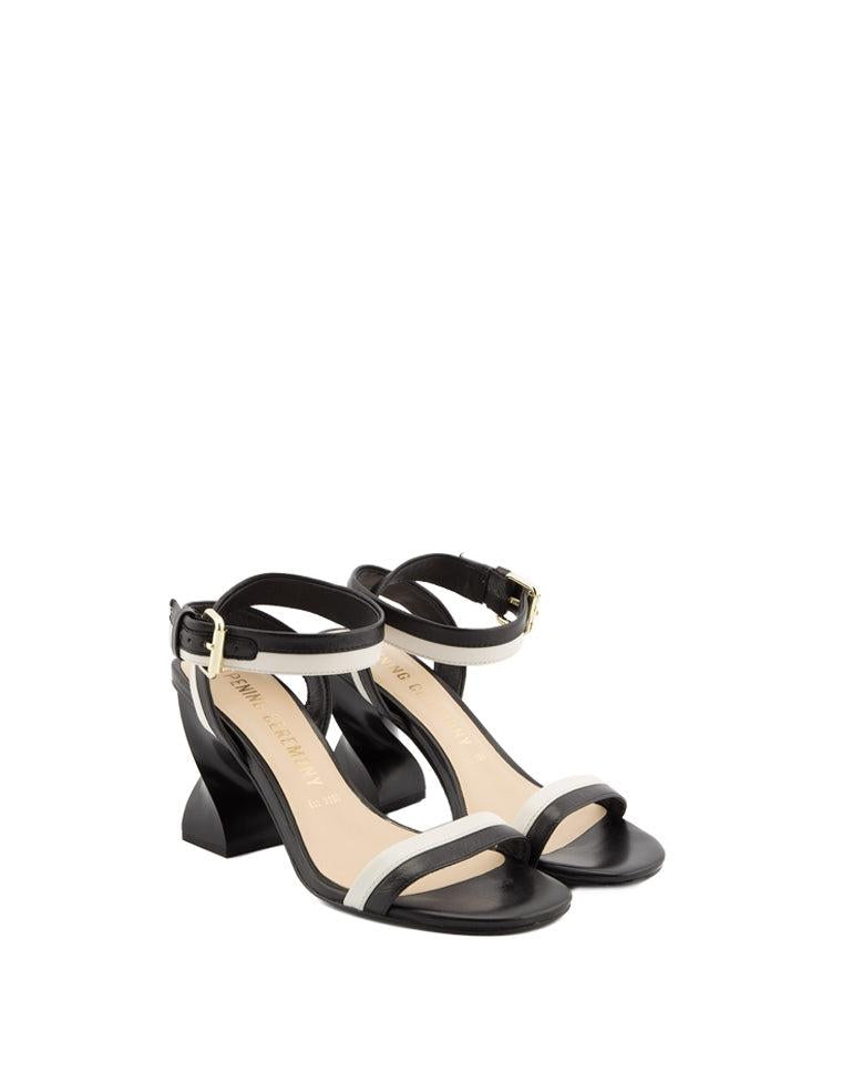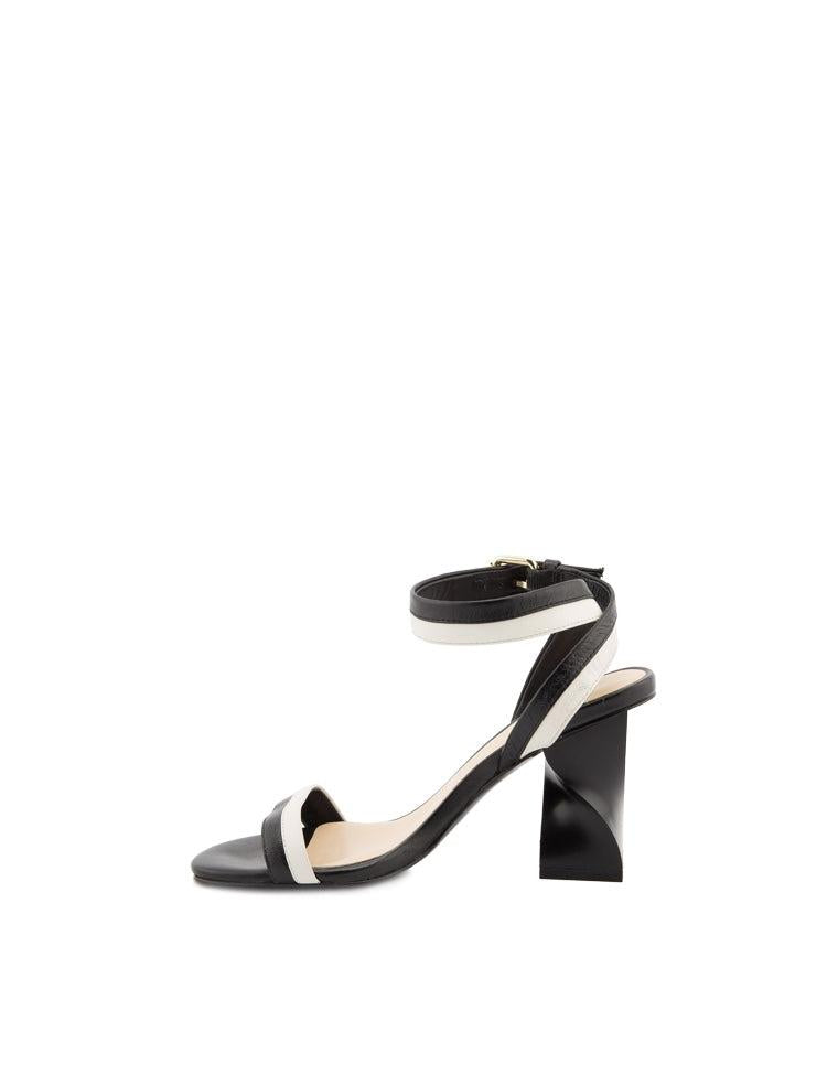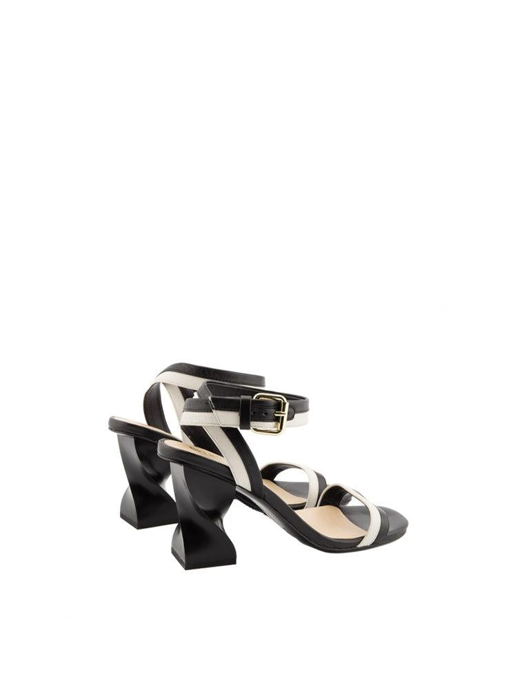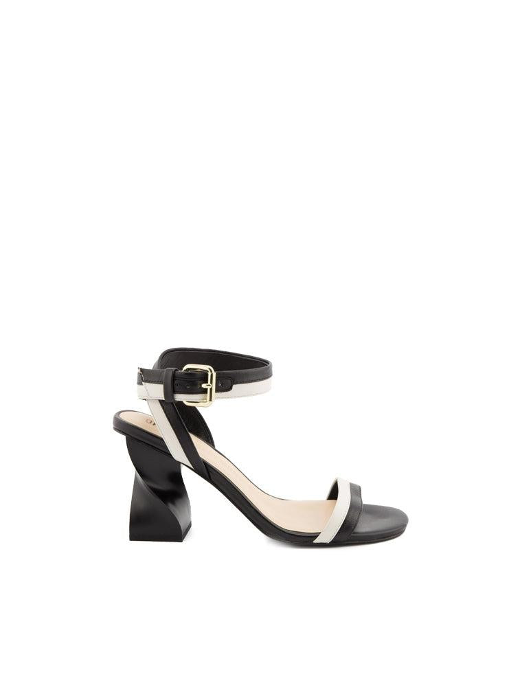 Leather sandals with twisted sculptural heel, bicolor details, open toe, and ankle buckle closure.