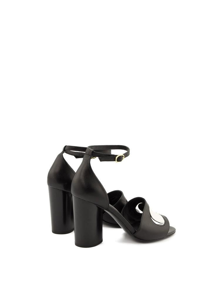 Leather sandals with a 10cm block heel, upper cut out detail, open toe, and ankle buckle closure.