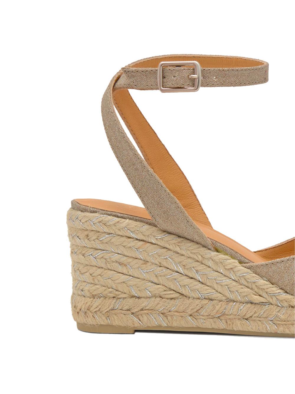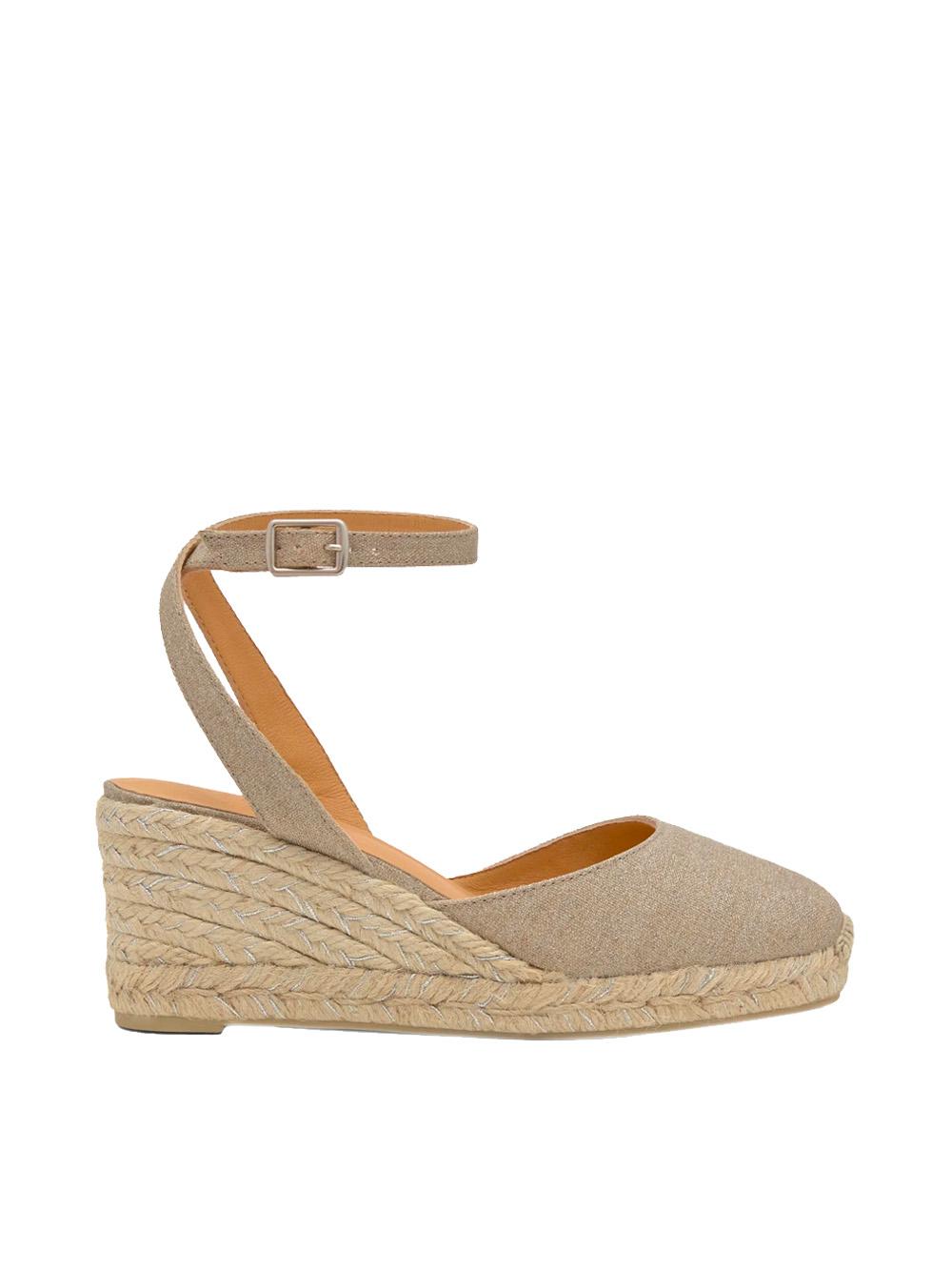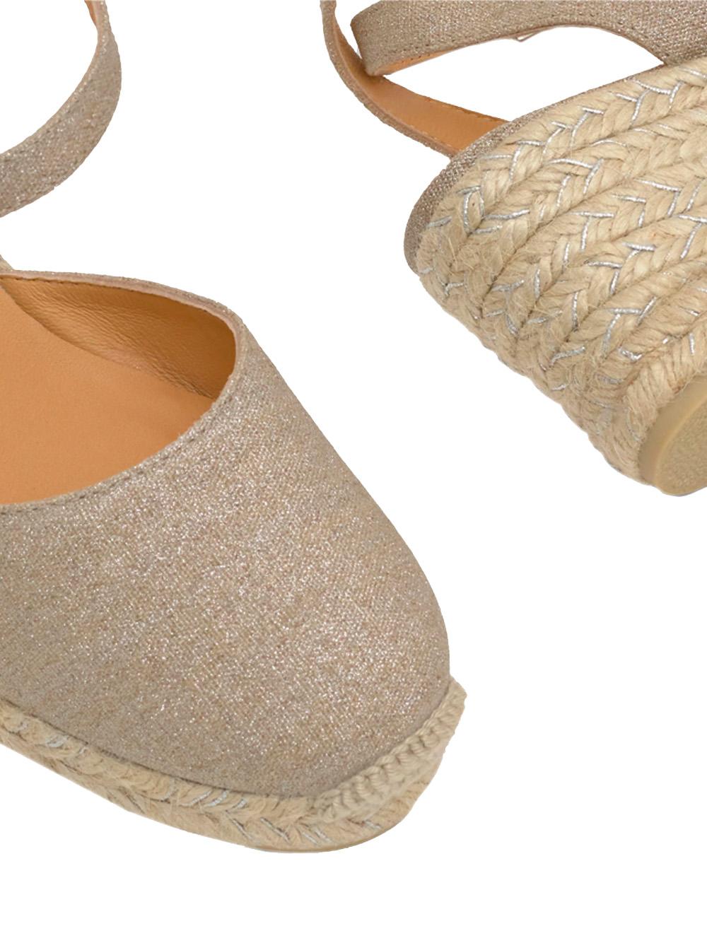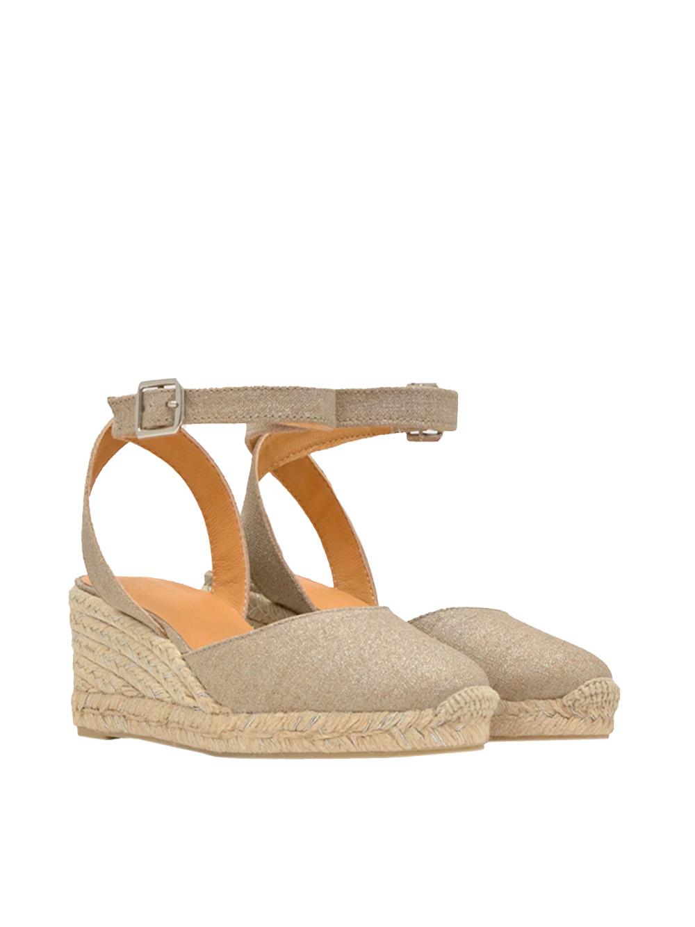 - Cybil espadrille in metallic linen with strap closure, padded insole