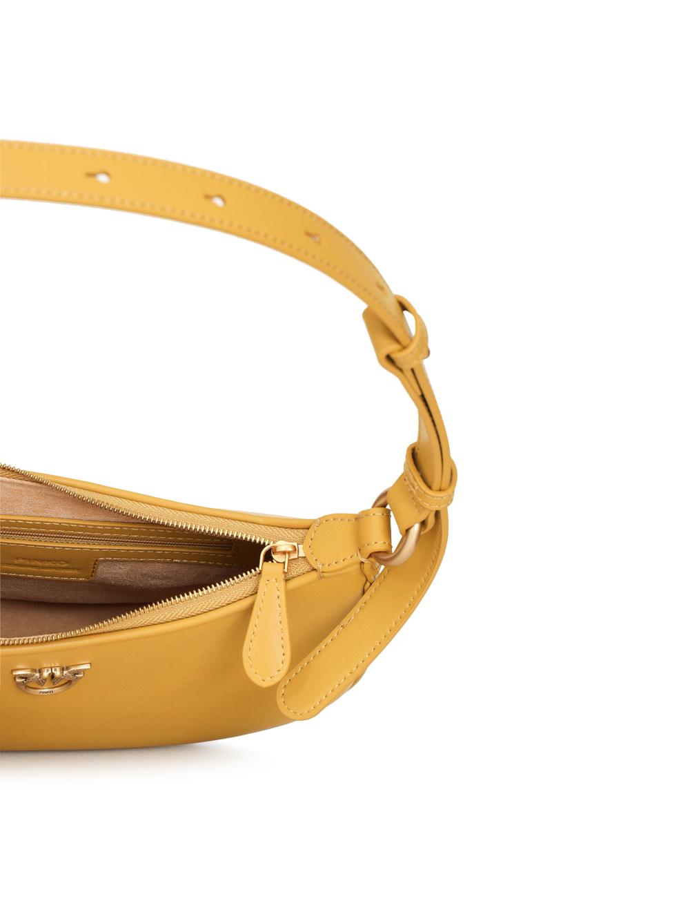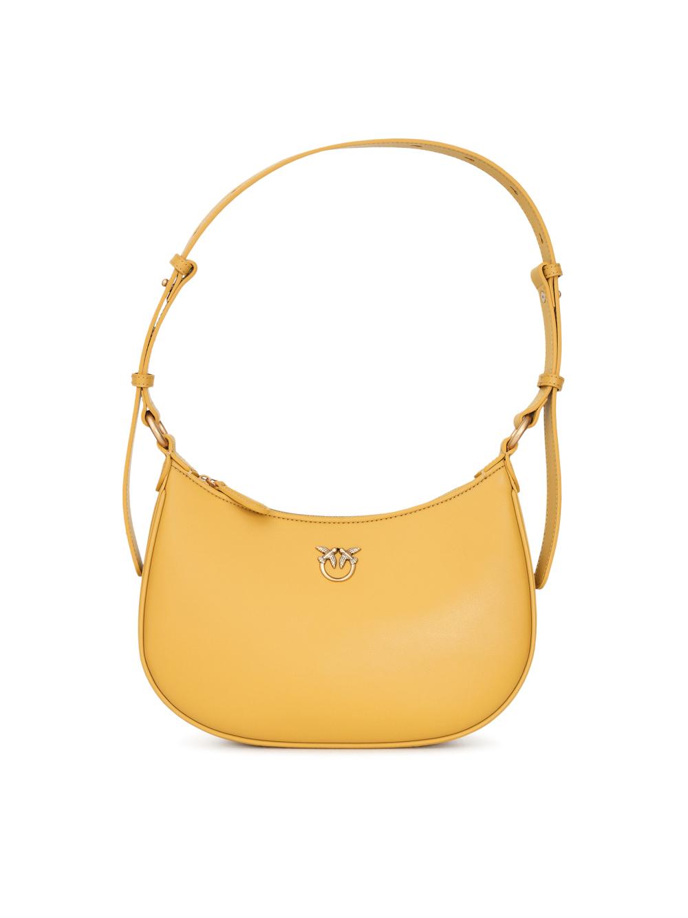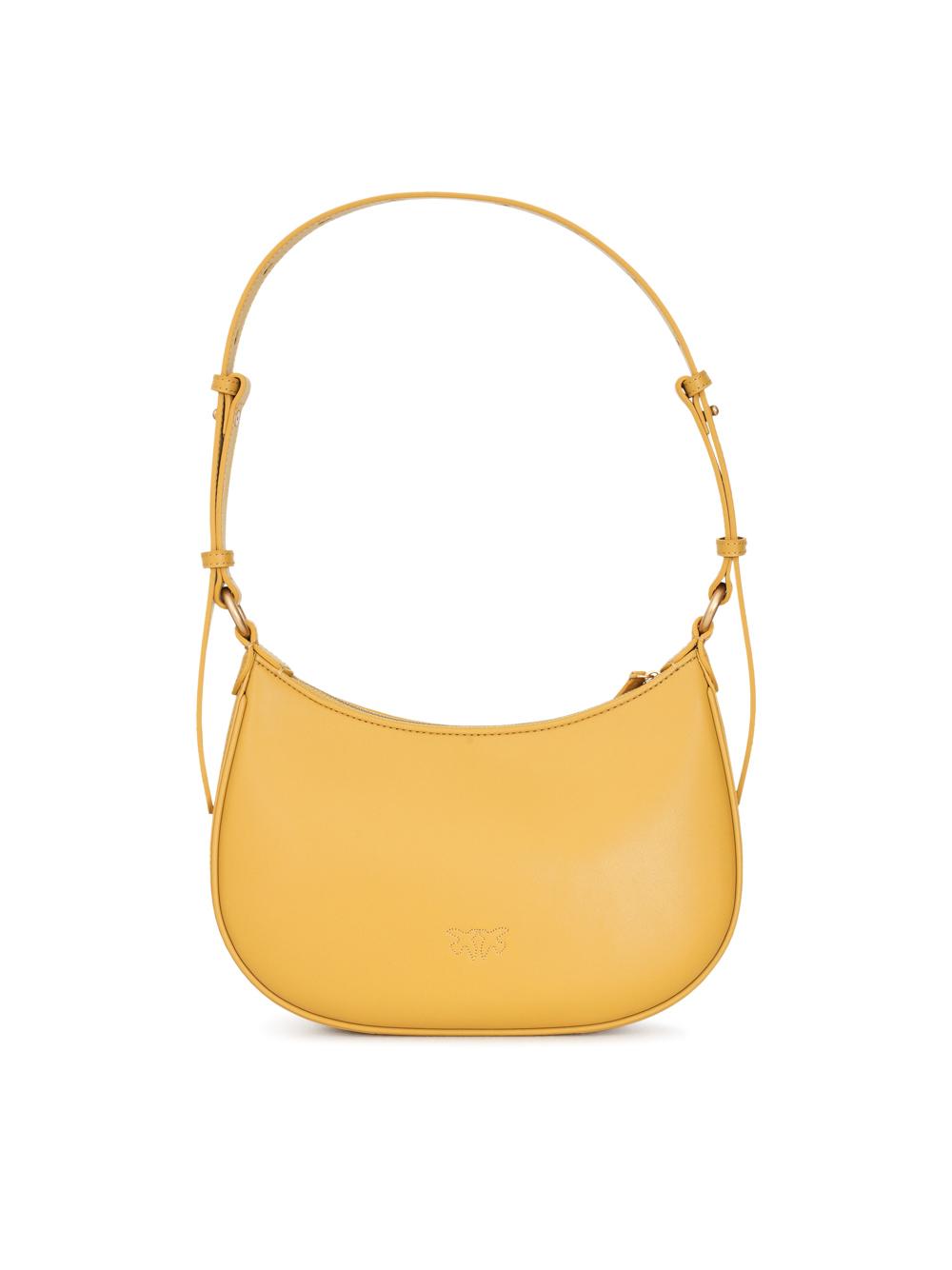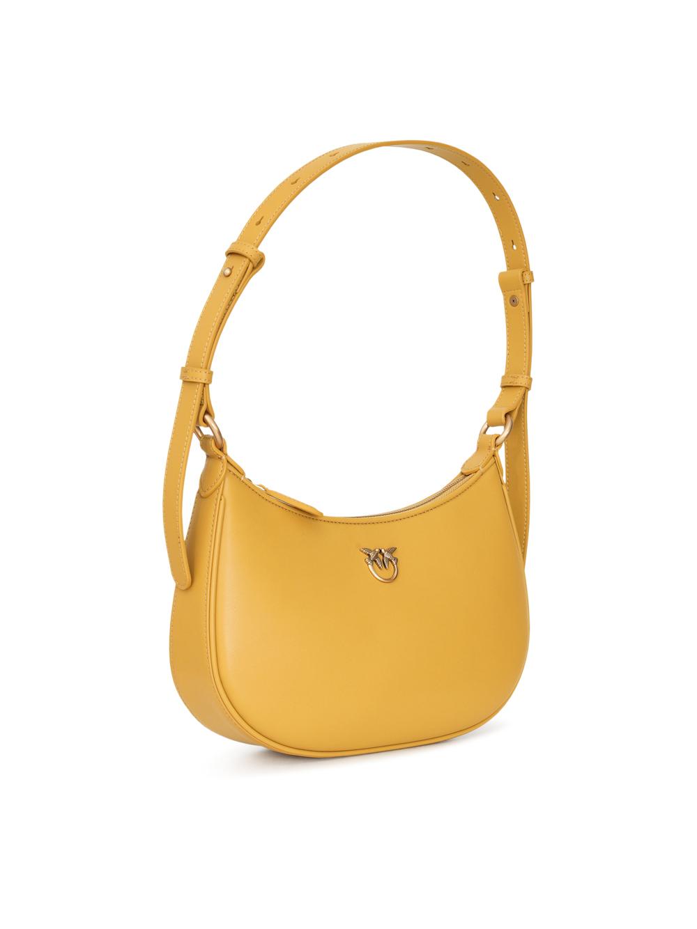 - Mini Love Bag Half Moon with a characteristic half-moon shape in soft silk-touch leather, customized with a Love Birds Diamond Cut metal plate, antique gold plating.