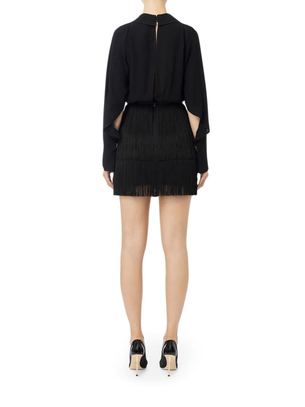 - Georgette shirt mini dress with foulard held by golden metal buttons and crêpe skirt with double ruffle of fringes.