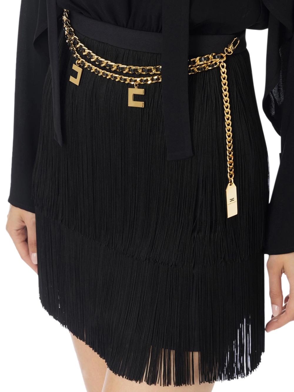 - The waist is emphasized by a golden metal belt with logo charms.