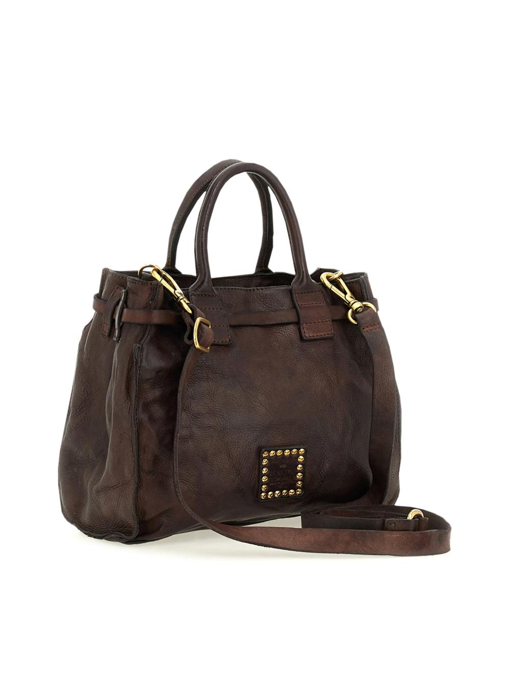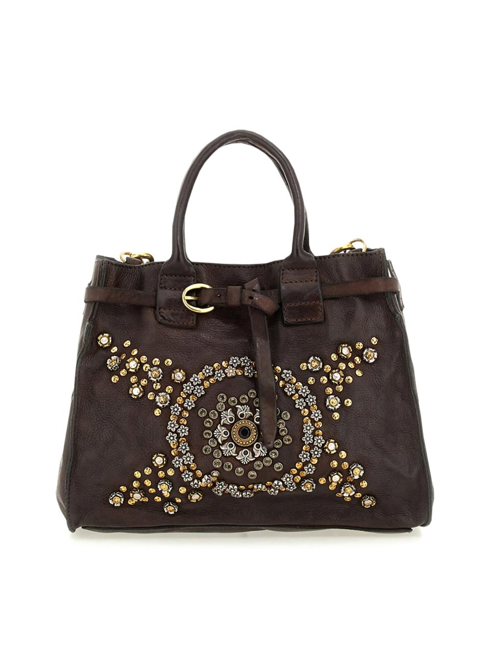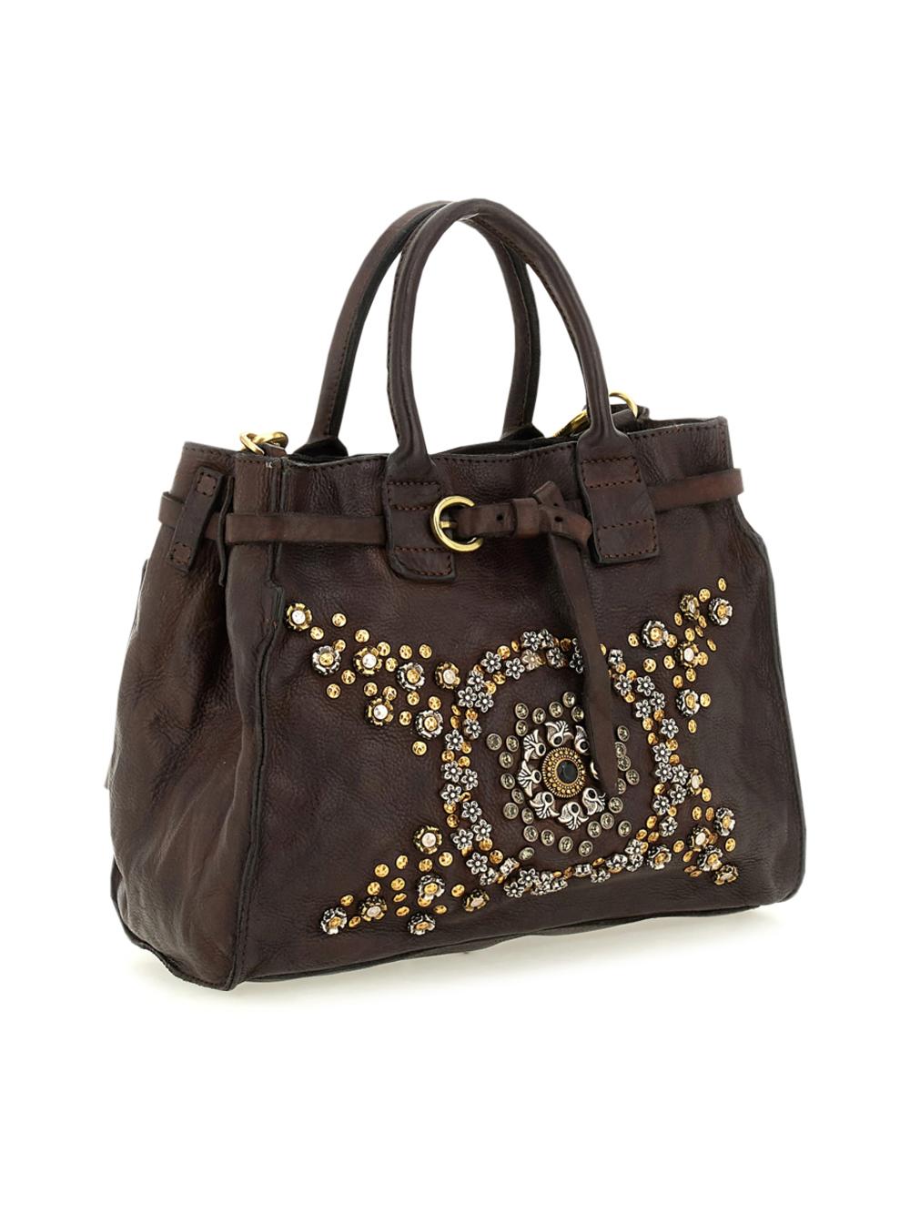 Borsa a mano "Rossella" in pelle marrone con borchie e strass