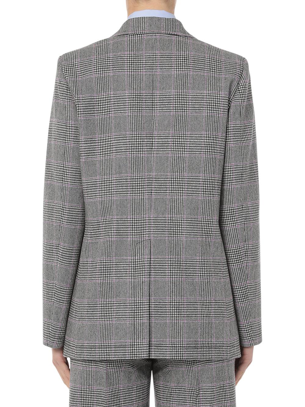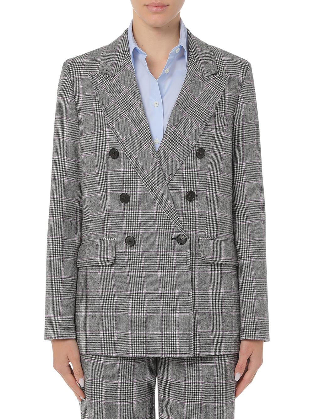 - Stretch wool blend fabric, fully lined interior, darts, notch lapel, double-breasted button closure, long sleeves, padded shoulders, welt pocket on the chest, two flap pockets on the front, central back vent, straight hem.