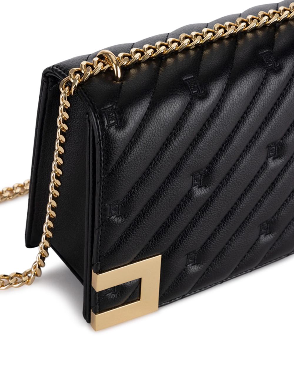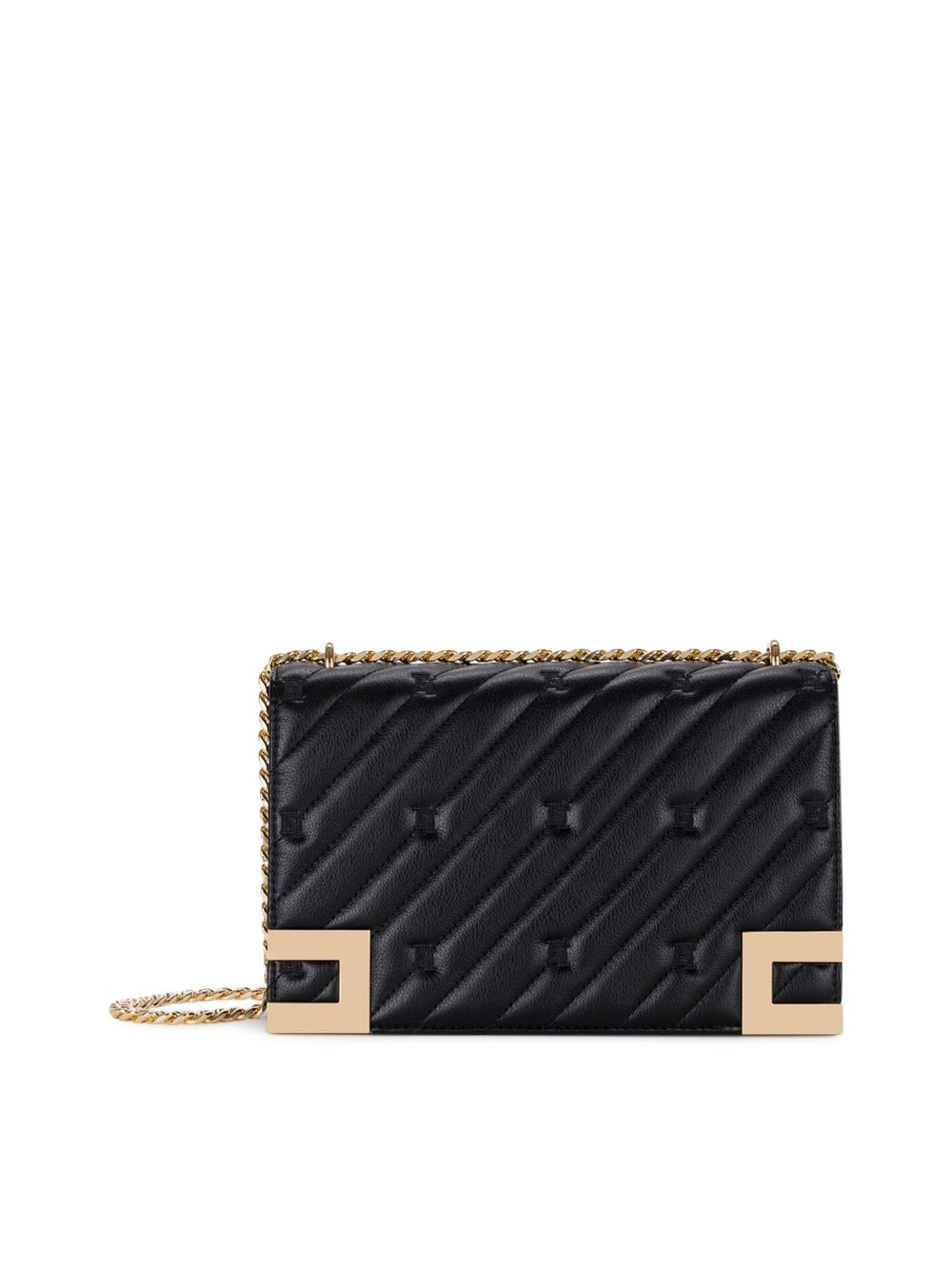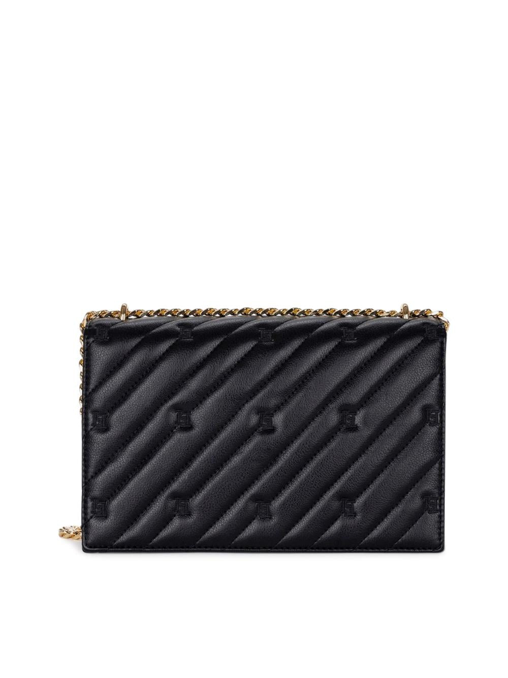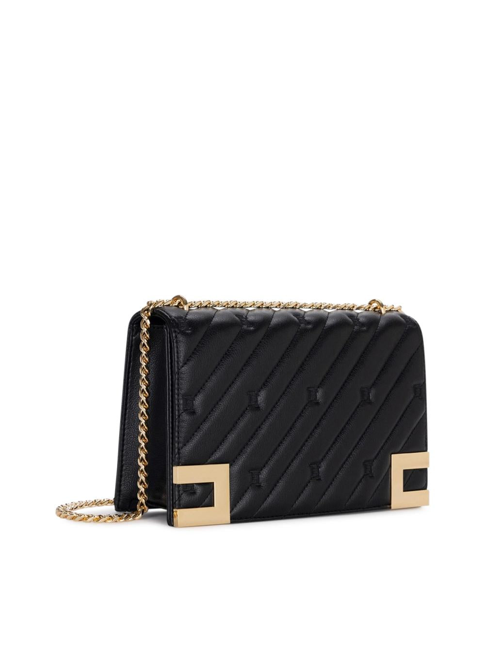 - It is characterized by a flap closure, logo plates on the sides, and a gold metal chain shoulder strap for shoulder portability.