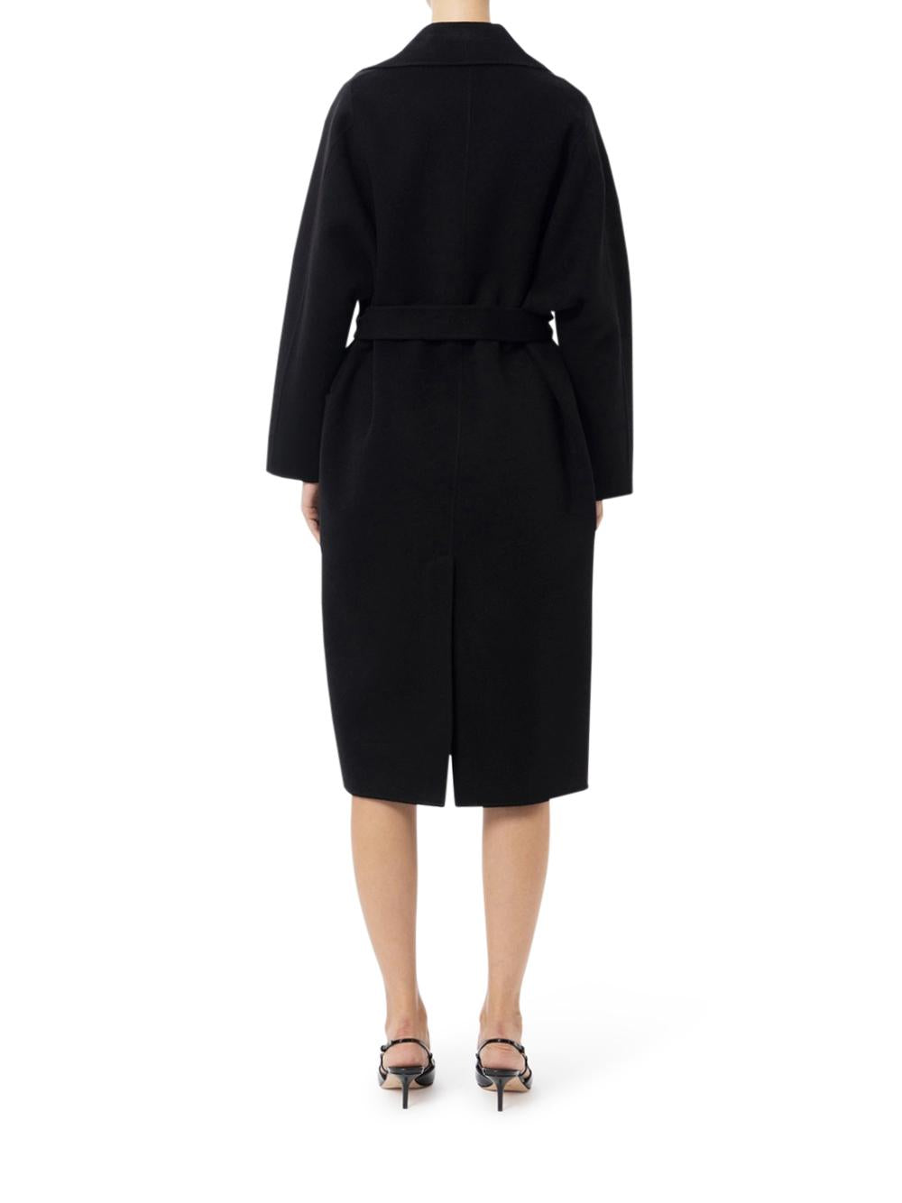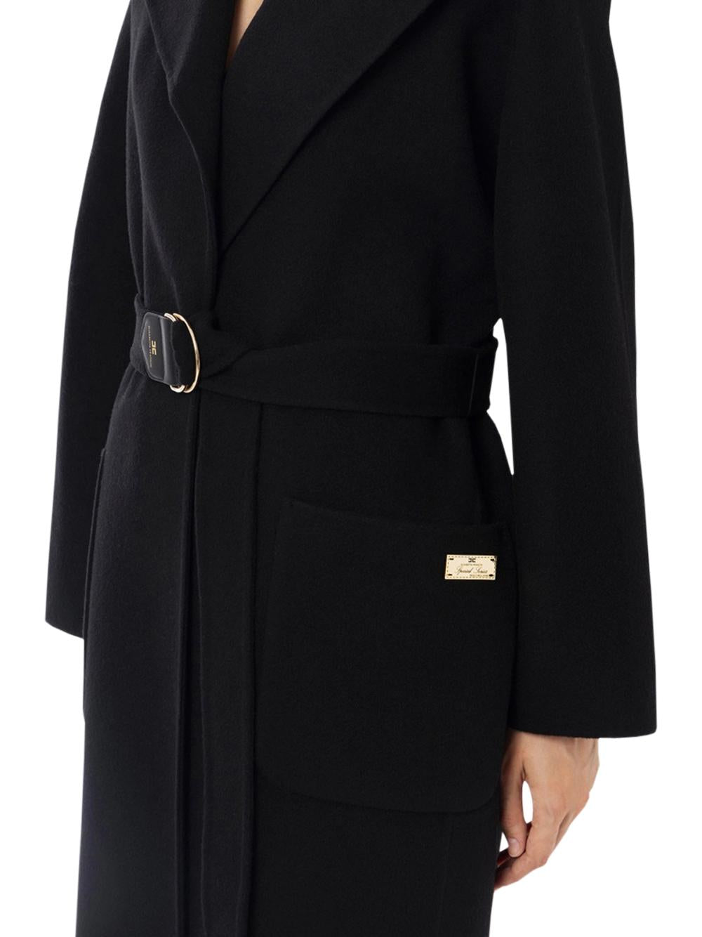 - Double pure wool coat with a robe-style line, featuring wide lapels and a golden metal collection label sewn onto the patch pocket.