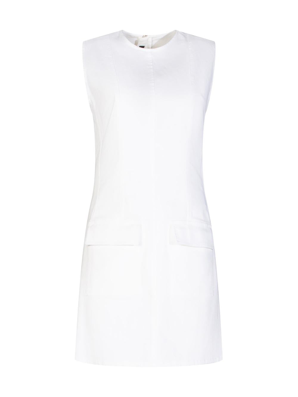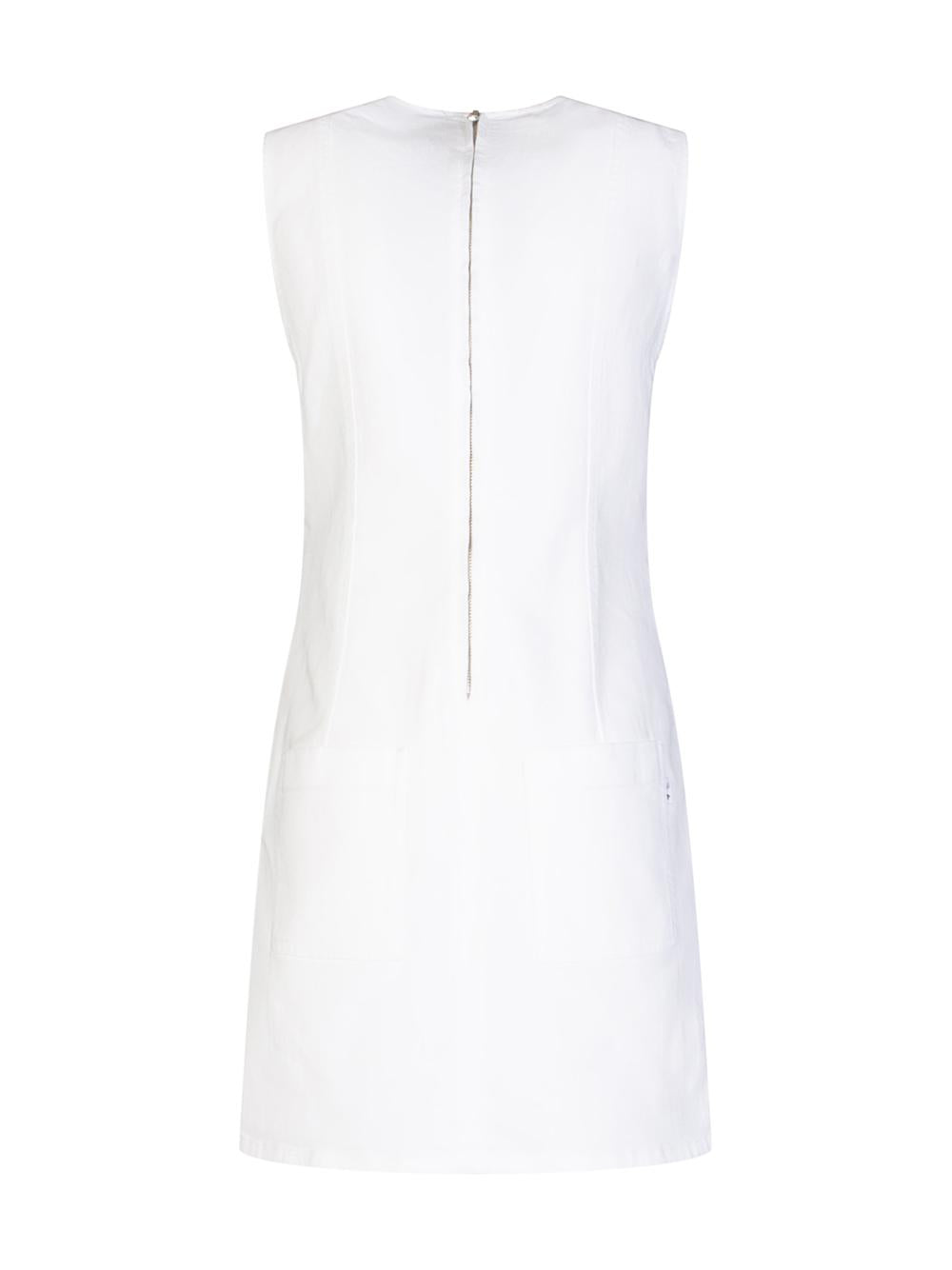 - White denim, round neckline, sleeveless, back zipper, two flap pockets in front and two patch pockets at the back