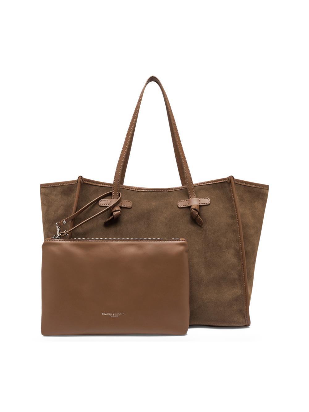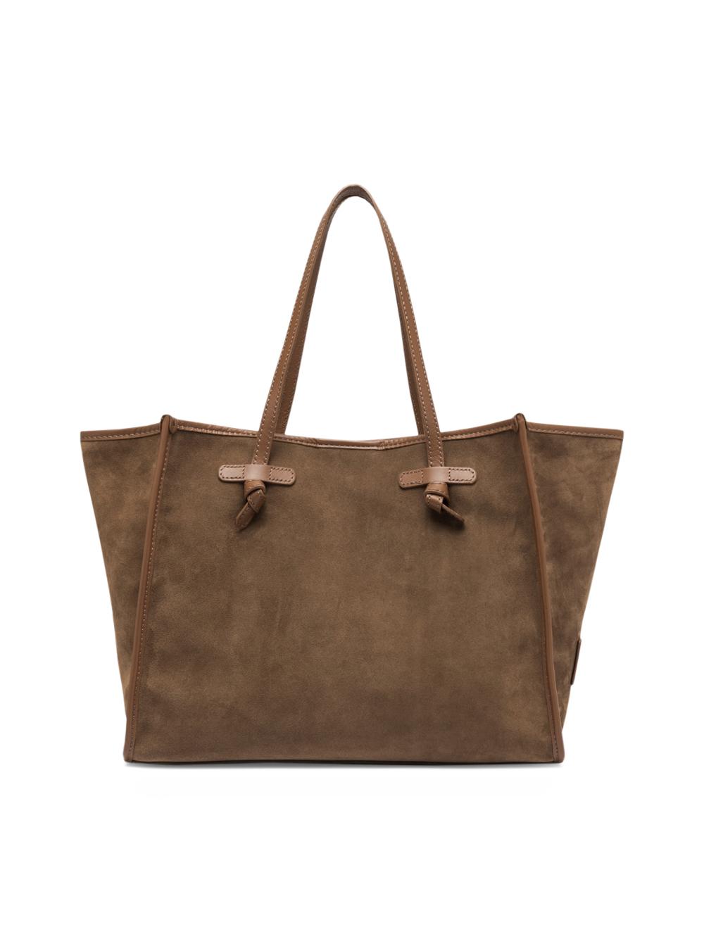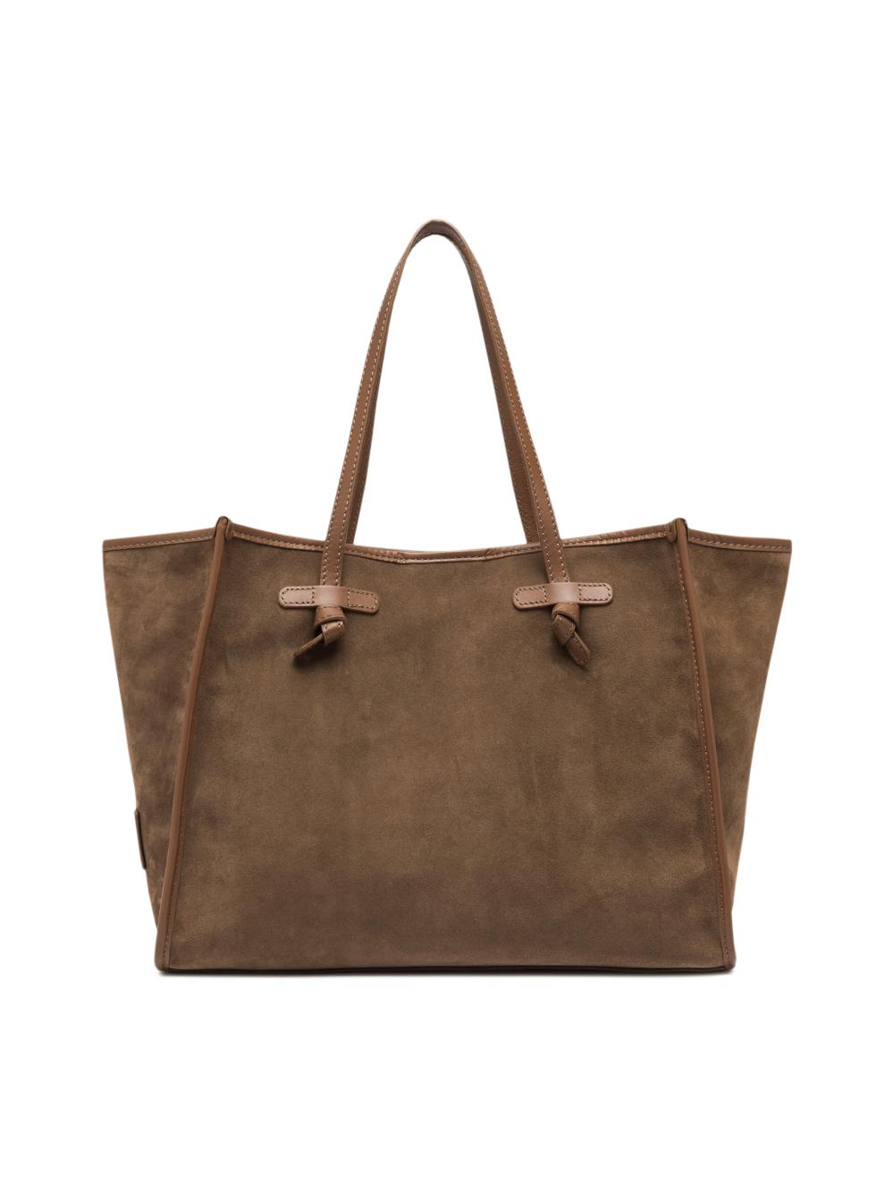 - The Marcella shopping bag by Gianni Chiarini Firenze, with its simple and refined silhouette, is made of suede leather and is embellished with tone-on-tone leather trims.