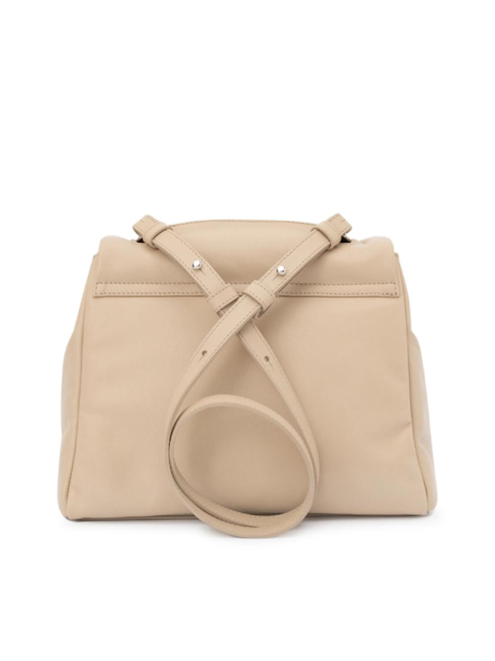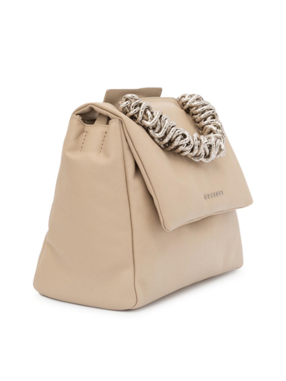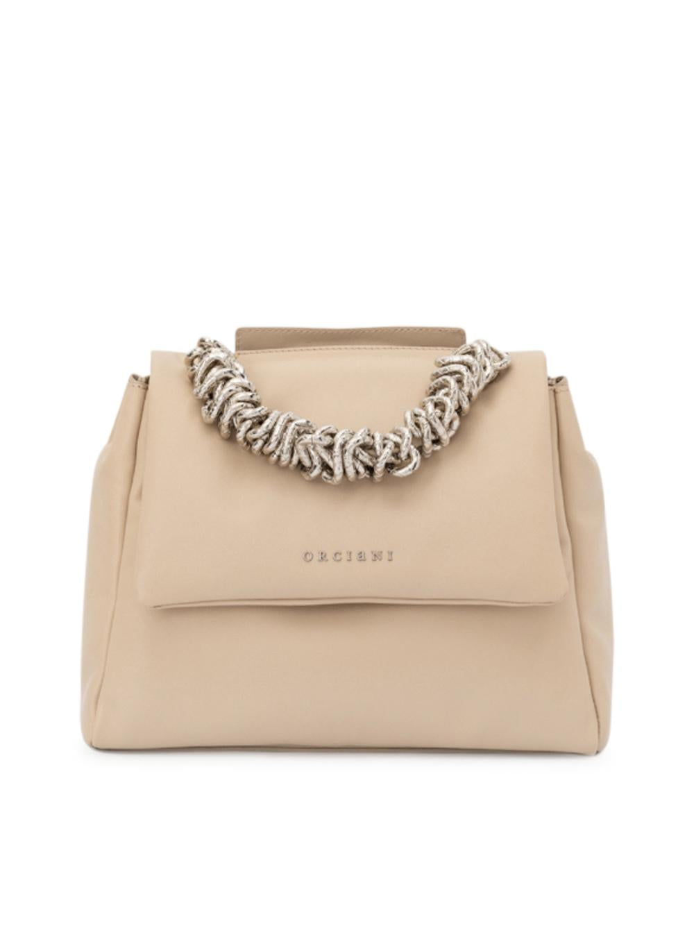 - Functionality: hidden opening at the top of the flap, leather handle and chain, adjustable shoulder strap