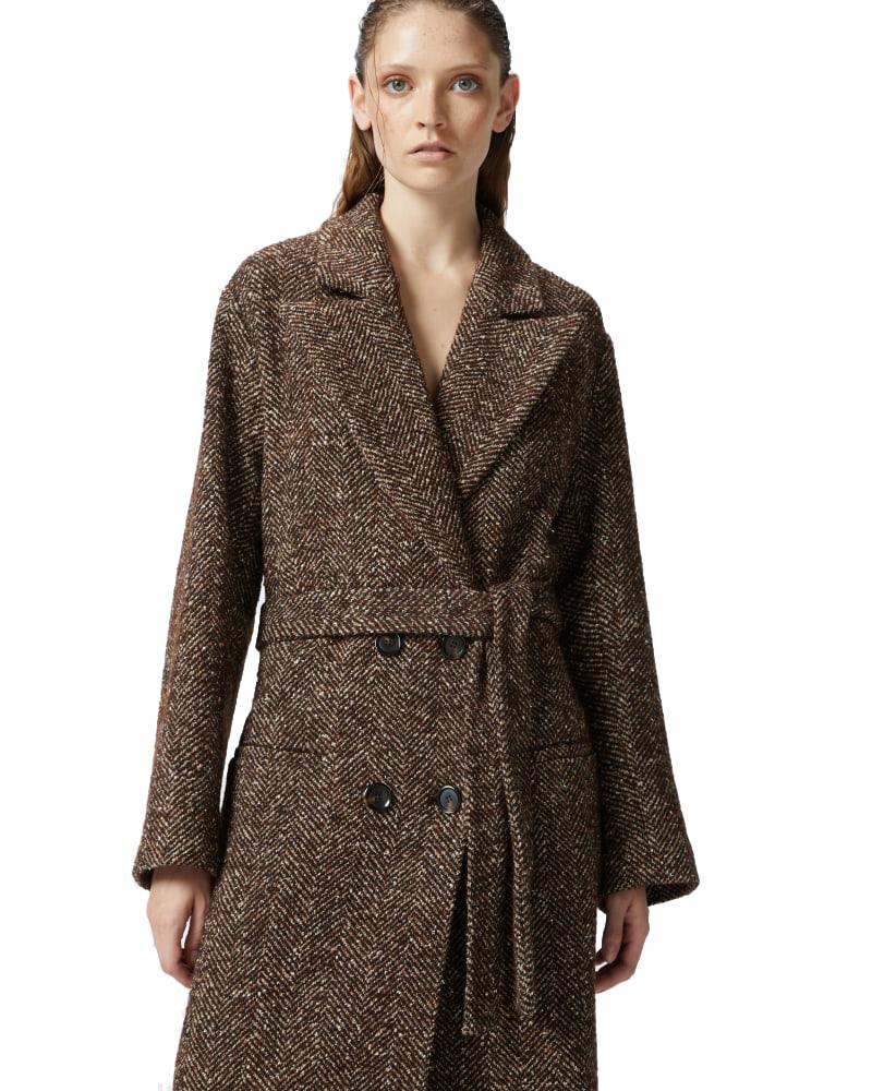 - Long ankle-length women's coat in mixed wool fabric with a fishbone pattern, simulating the lines of a fishbone, in shades of brown and camel.