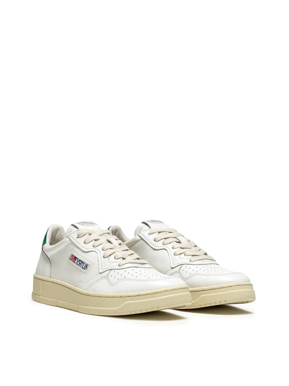 - This women’s sneaker is made from soft, natural-looking white leather, finished with micro-perforated detailing on the toe for excellent breathability. The green leather heel tab adds a touch of color to the look.