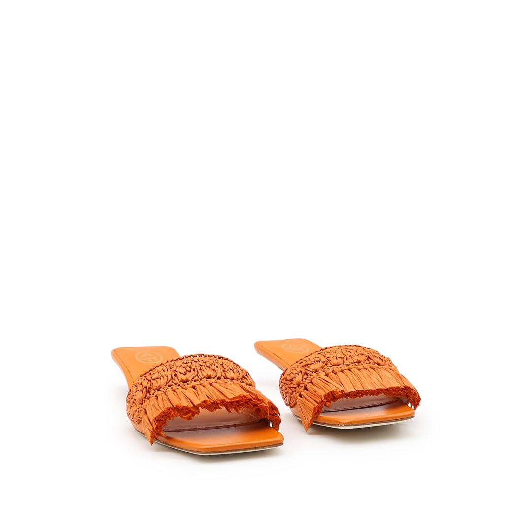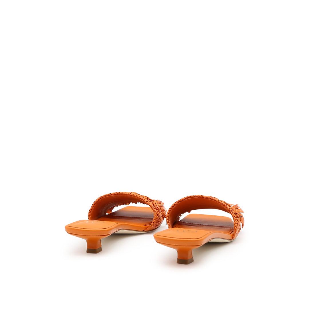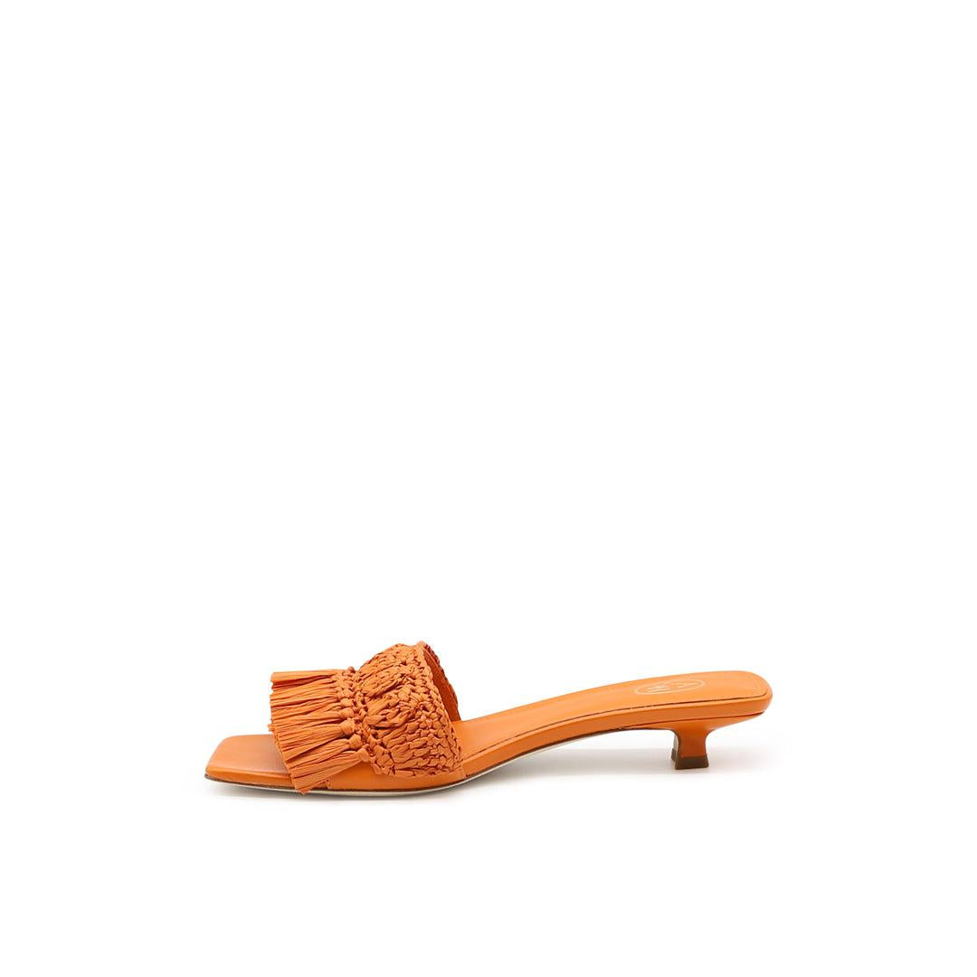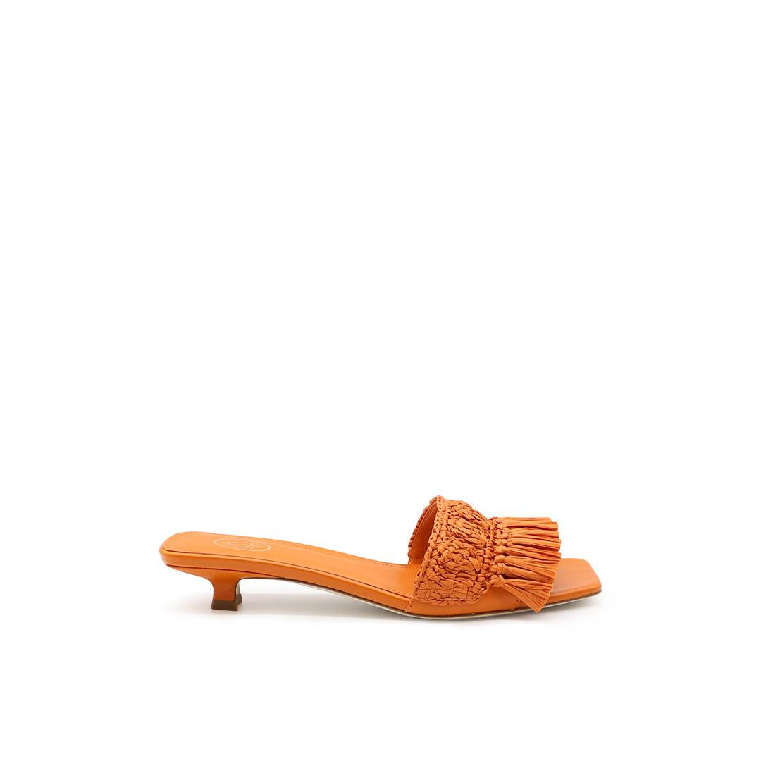 Sandali con tacco basso Nomad in pelle arancione con nappine in rafia