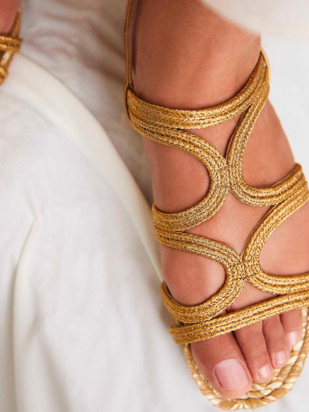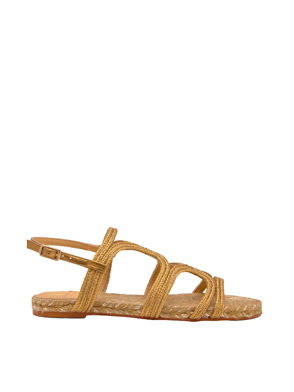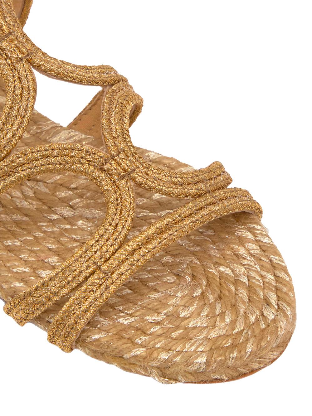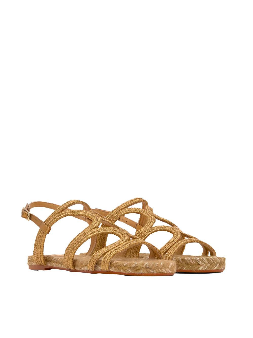 - Sandalo piatto Pitra con intreccio artigianale metallizzato, chiusura a fibbia e suola in juta con base in cuerolite.