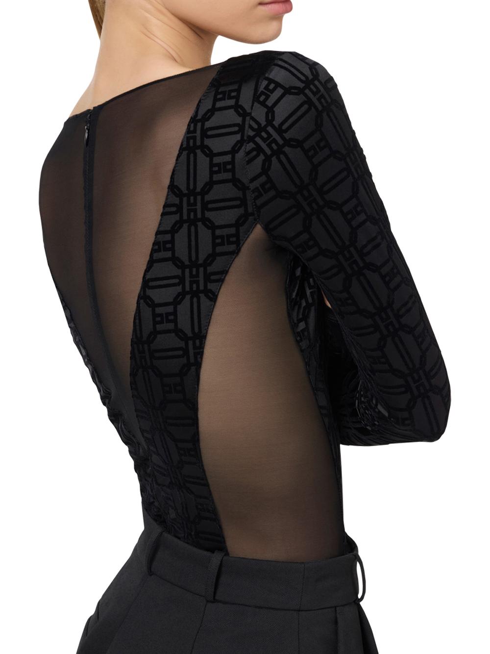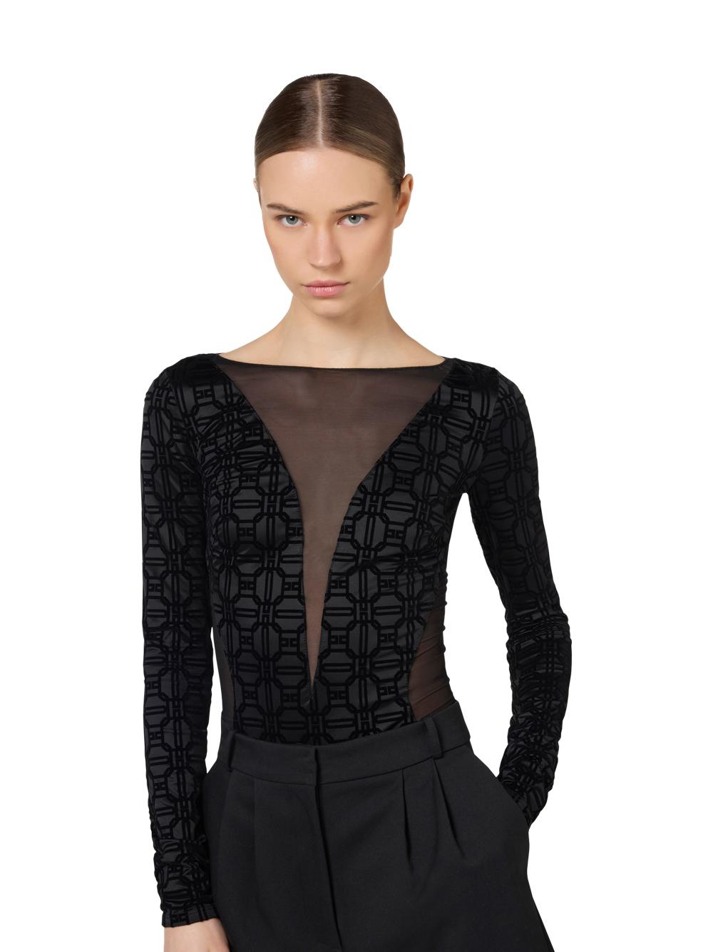 - Body in lycra flock all-over con maniche lunghe a guanto e scollo a barca.