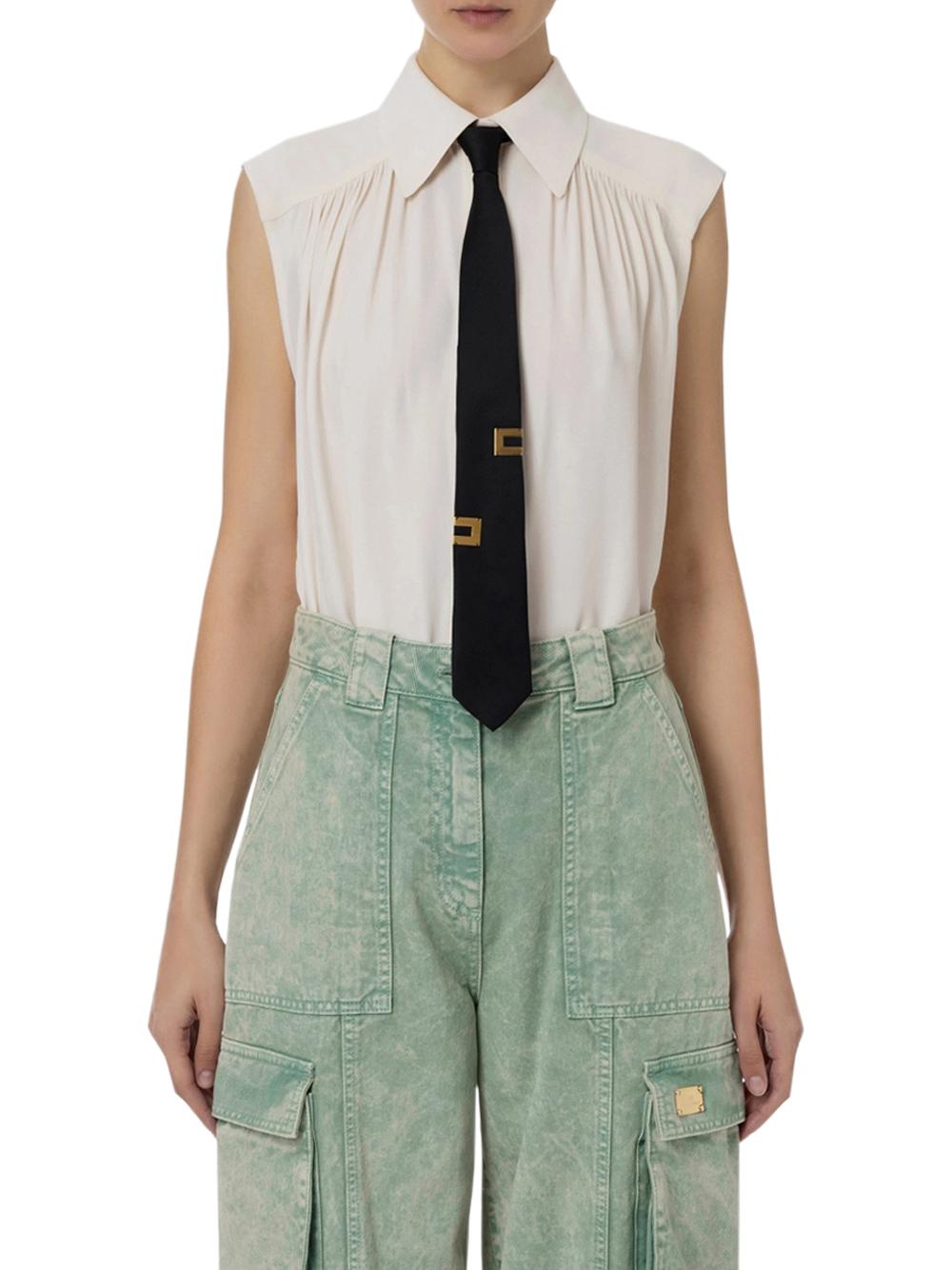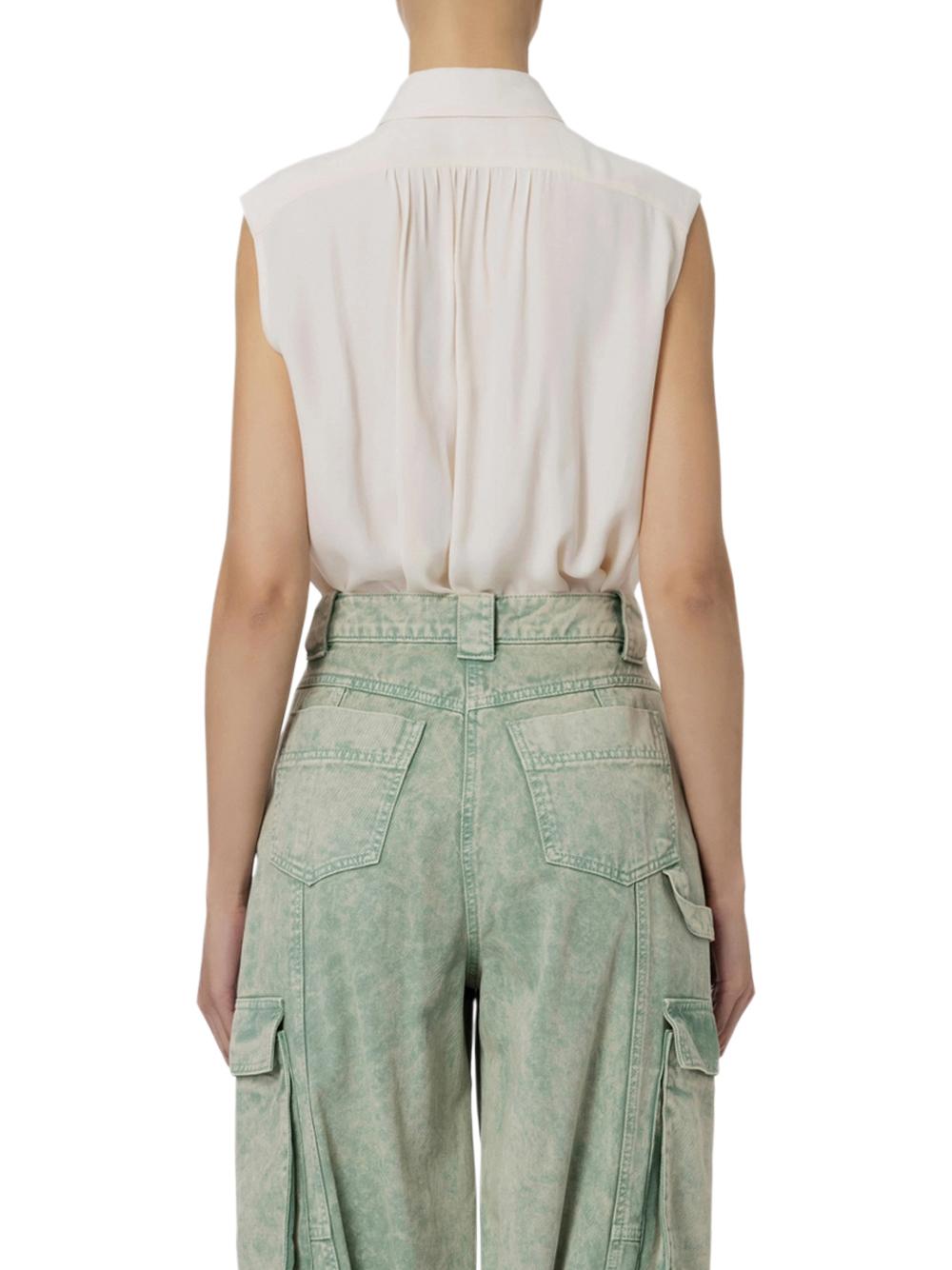 - Camicia smanicata in georgette di viscosa con arricciature sulle spalle.