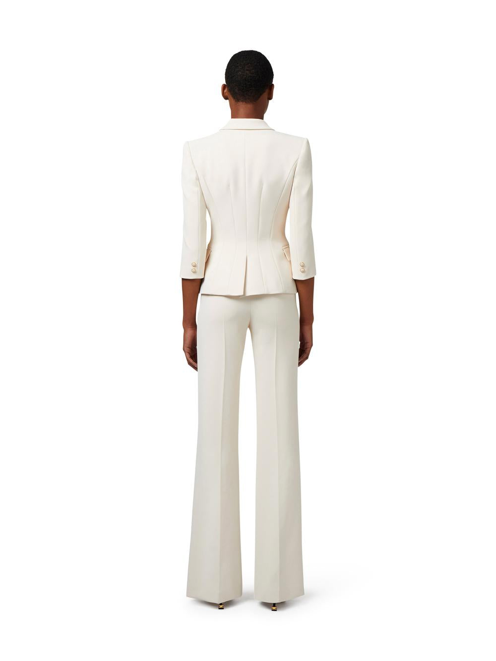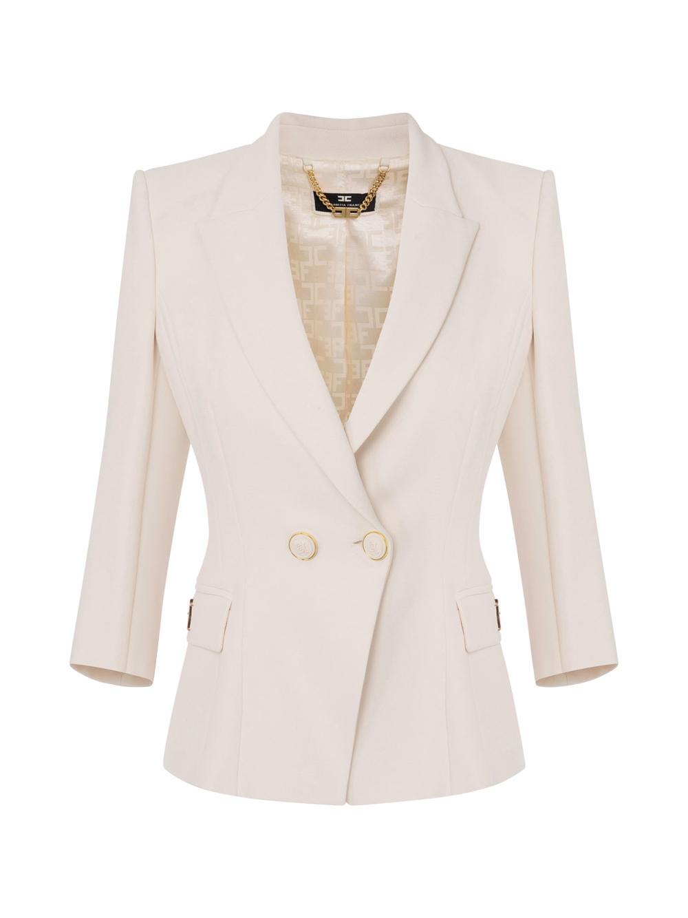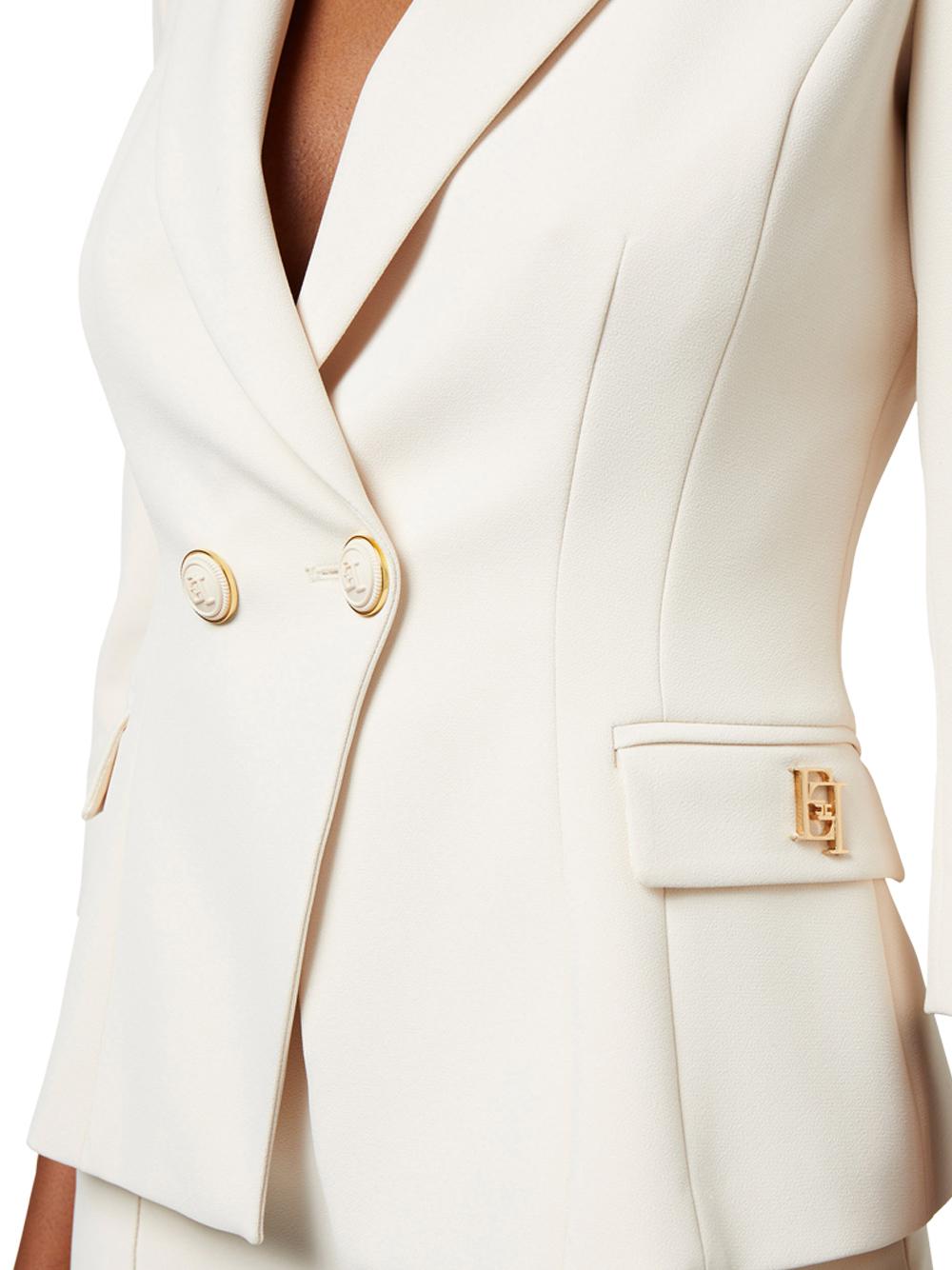 - Giacca doppiopetto in doppio crêpe con tasche frontali con pattina e placca logo in metallo dorato