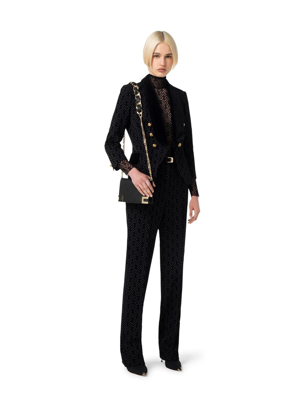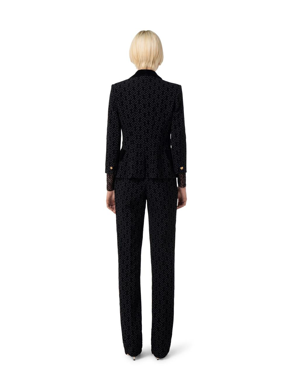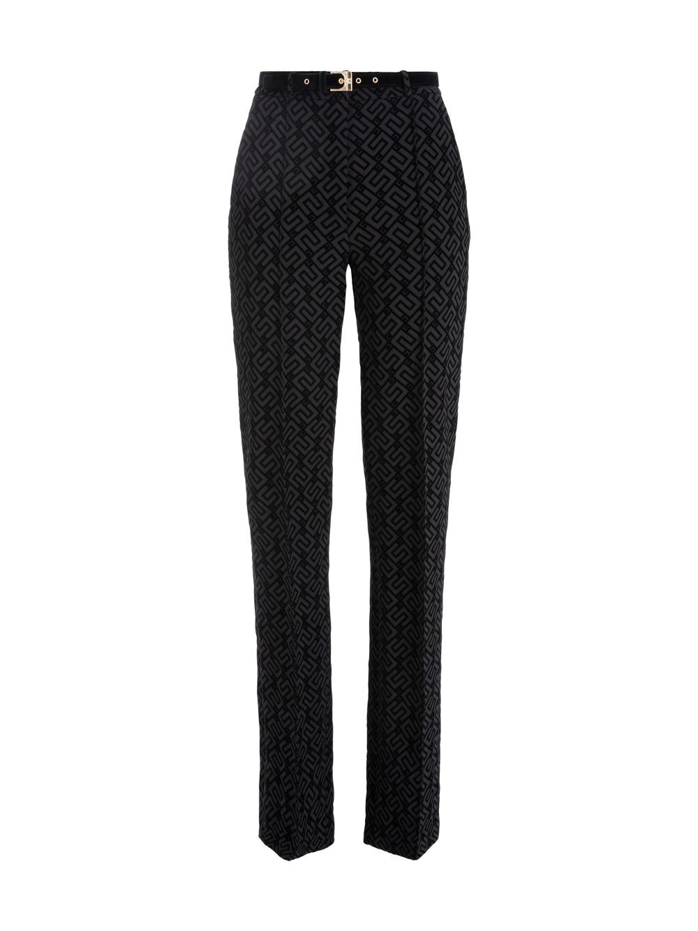- Pantalone a sigaretta con vita alta in crêpe stretch con stampa logo flock all-over.