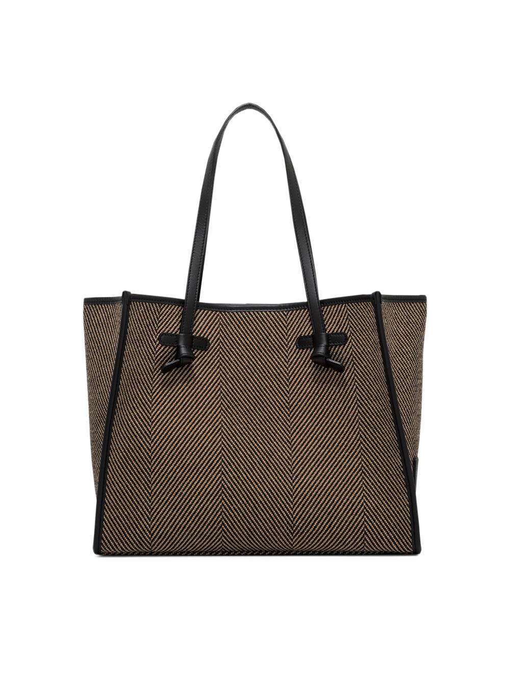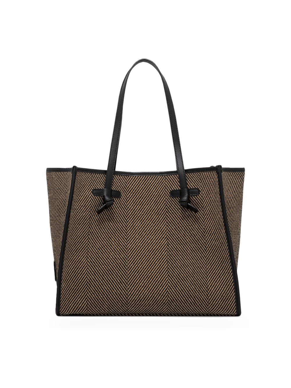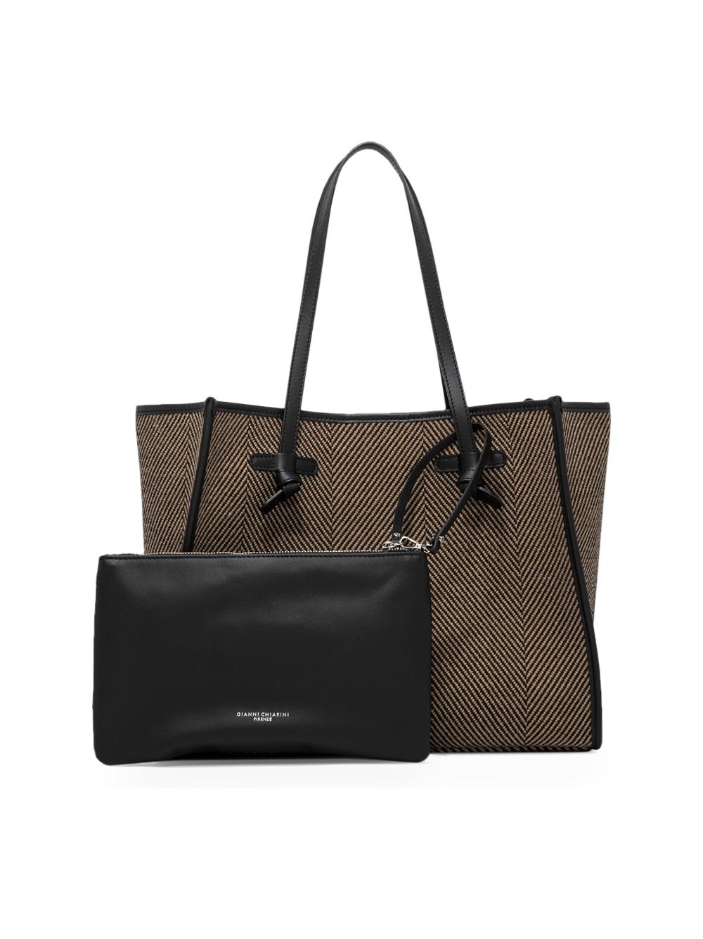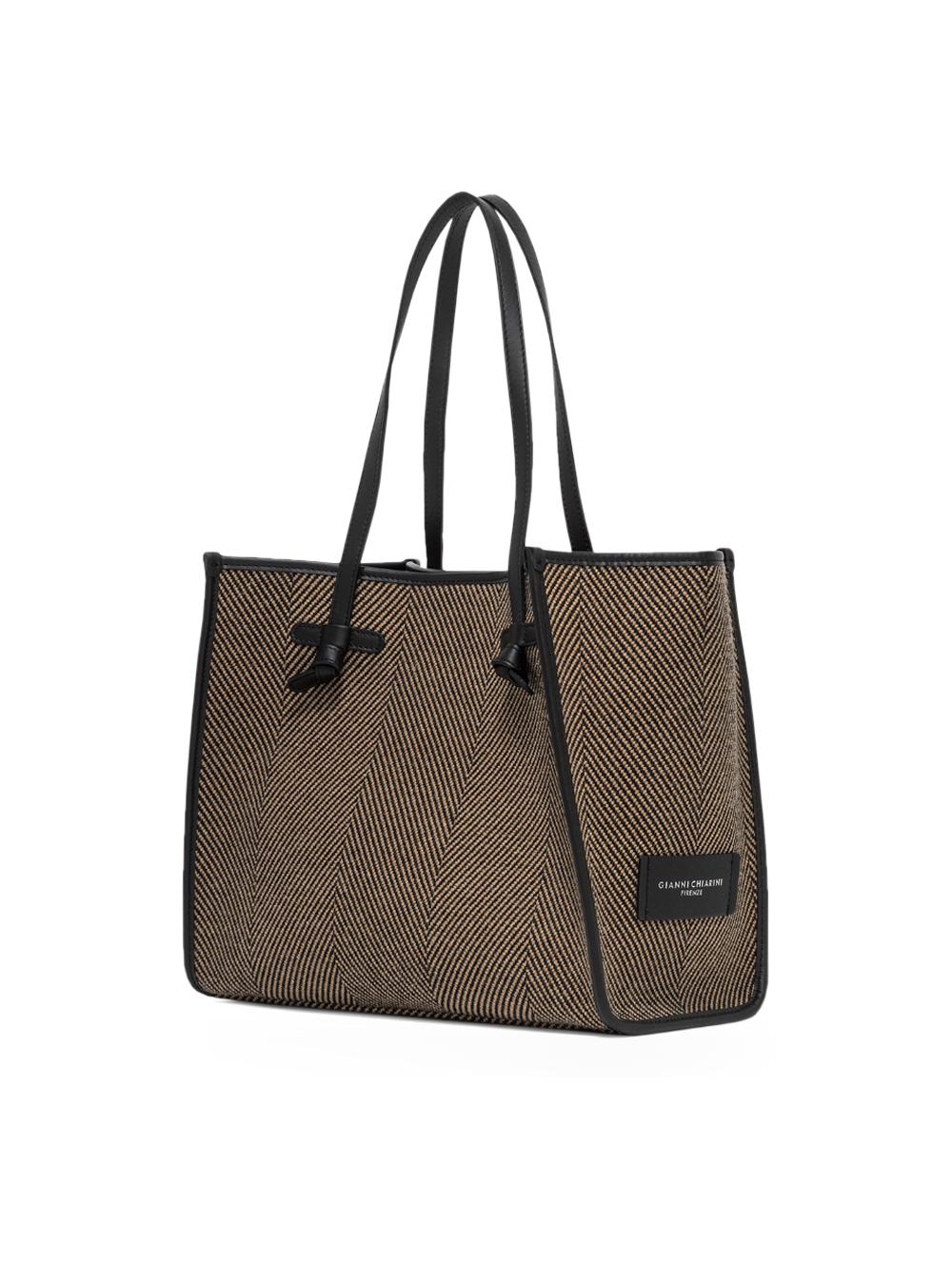 - La shopping Marcella by Gianni Chiarini è realizzata in tessuto spigato. Il design minimal è arricchito da profili in pelle che regalano alla borsa un tocco di eleganza.